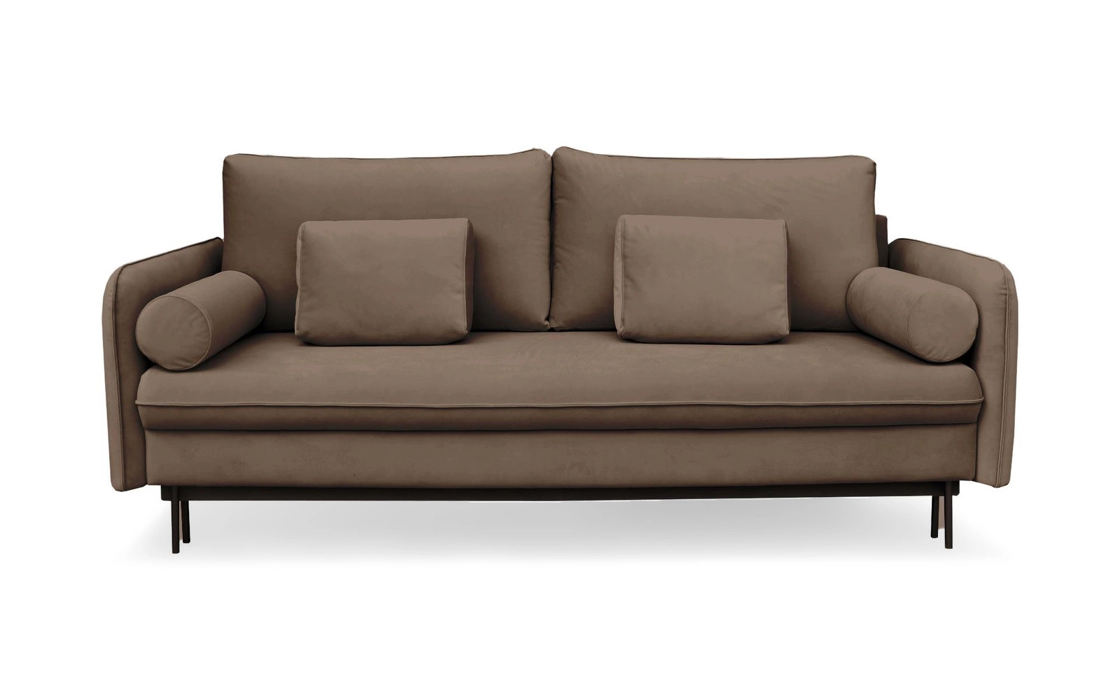 Sofa rozkładana Diana marki Intesi to nowoczesny, trzyosobowy mebel tapicerowany w eleganckim brązowym kolorze, który łączy funkcję komfortowej kanapy do codziennego relaksu z praktycznym łóżkiem o powierzchni spania 195×135 cm. Wysokie, ergonomiczne oparcie i podłokietniki zapewniają wygodę, a wbudowany pojemnik na pościel pozwala uporządkować przestrzeń w salonie. Trwała tkanina Louis 669 i solidna podstawa z drewna sosnowego oraz metalu gwarantują nie tylko trwałość na lata, ale też ponadczasowy wygląd w stylu skandynawskim.