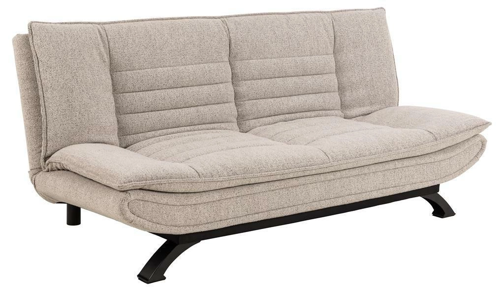 Rozkładana sofa tapicerowana Faith. Nowoczesna i praktyczna rozkładana sofa jest idealna do mieszkań studenckich i pokoi gościnnych. Beżowa tapicerka jest miękka w dotyku, a solidne czarne metalowe nogi zapewniają wsparcie w trzech pozycjach: wyprostowanej, odchylonej i płaskiej.