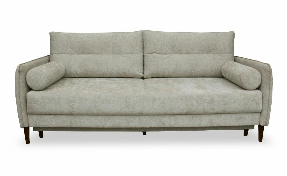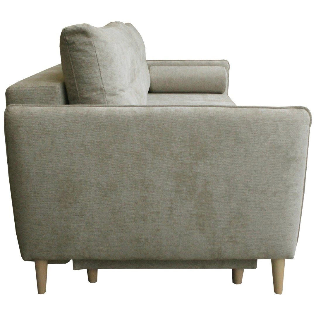 Nowoczesny design sofy Lika łączy prostotę formy z subtelną elegancją, tworząc wyjątkową atmosferę w pokoju dziennym. Aksamitna tkanina w odcieniu beżu pięknie odbija światło i sprawia, że sofa staje się efektownym centrum aranżacji, wprowadzając do wnętrza przytulność oraz wyrafinowany styl. Naturalny kolor nóg z orzecha podkreśla lekkość i ponadczasowy charakter mebla, dzięki czemu sofa świetnie komponuje się zarówno w jasnych, jak i ciemniejszych aranżacjach salonu.