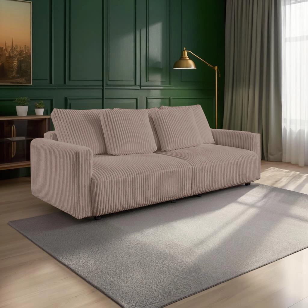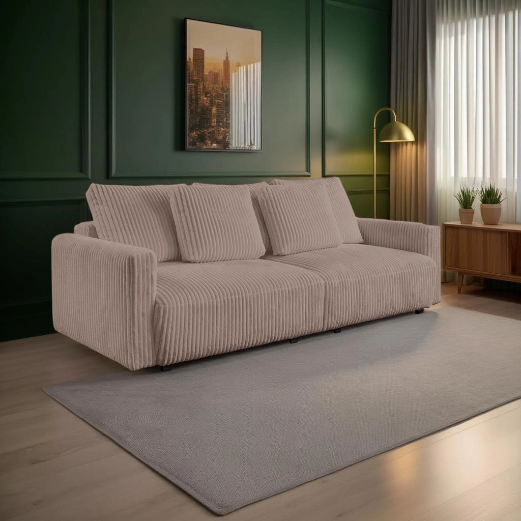 Sofa rozkładana Loppie marki Intesi to nowoczesna propozycja dla tych, którzy szukają połączenia stylu, wysokiej funkcjonalności oraz wygody na co dzień. Wykonana z wytrzymałego drewna sosnowego i metalu, tapicerowana miękką sztruksową tkaniną w odcieniu ciemnego beżu, zachwyca subtelną strukturą i modnym wyglądem. Jej największym atutem jest praktyczna funkcja spania – powierzchnia o wymiarach 222x155 cm sprawia, że Loppie doskonale sprawdzi się zarówno jako sofa do salonu, jak i wygodne miejsce do snu dla dwóch osób.
