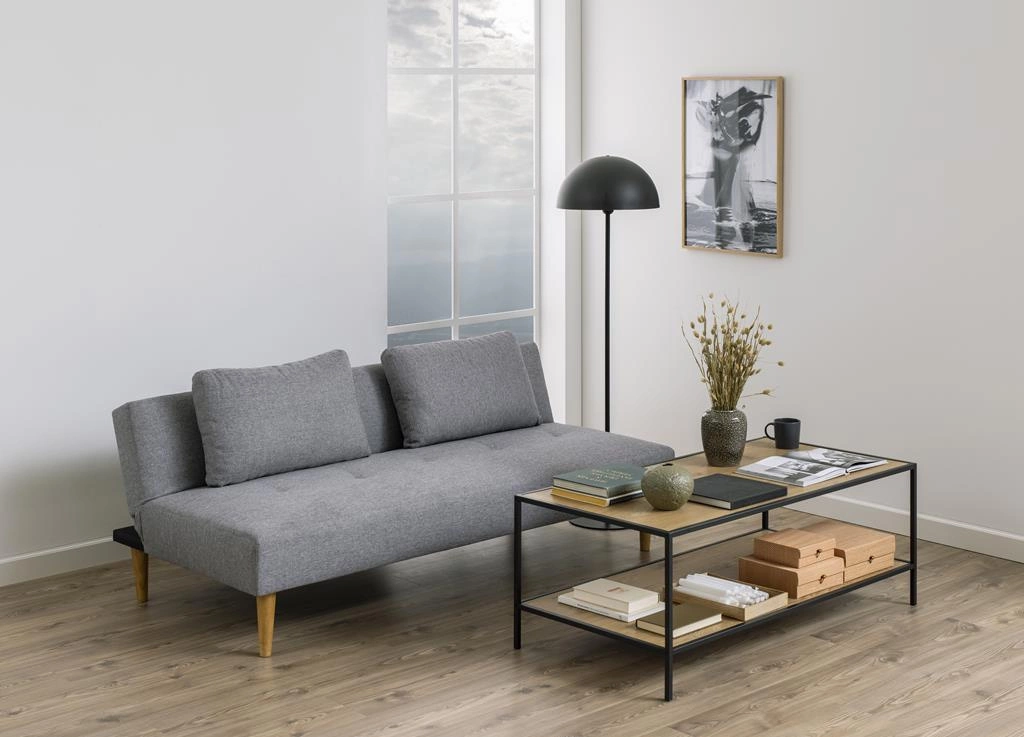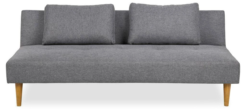 Ten nieduży mebel jest jednocześnie bardzo praktyczny. Ma możliwość pełnego rozłożenia, dzięki czemu z powodzeniem może służyć jako dodatkowe miejsce do spania. Powierzchnia spania 100x180cm pozwoli wygodnie wypocząć niespodziewanym gościom. Jego nóżki wykonane są z lakierowanego drewna kauczukowca w kolorze dębu, zaś wypełnienie stanowią elastyczne sprężyny i gęsta pianka poliuretanowa. Wysokie 20 cm nóżki sofy sprawdzą się w mieszkaniach, w których odkurzaniem zajmuje się jeżdżący nieduży odkurzacz. Nóżki dodatkowo wykończone zostały filcowymi podkładkami, które zabezpieczą podłogę przed ewentualnym porysowaniem podczas przesuwania sofy. Mebel nie posiada podłokietników, ma za to dwie dodatkowe, wygodne poduszki.