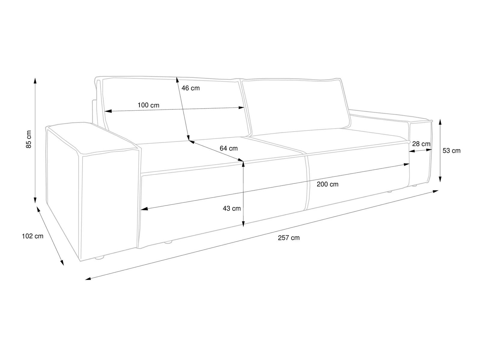 Sofa rozkładana Molde marki Intesi to trzyosobowa propozycja, która łączy w sobie skandynawską lekkość formy, sztruksową tapicerkę w ciepłym odcieniu beżu oraz praktyczność na co dzień. To doskonały wybór do salonu lub pokoju młodzieżowego, gdzie liczy się zarówno komfort wypoczynku, jak i funkcjonalność. Szerokość 257 cm zapewnia dużo miejsca dla rodziny lub gości, a powierzchnia spania 200×135 cm oraz pojemnik na pościel czynią z niej wszechstronną sofę z funkcją spania.