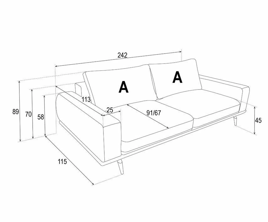 Konstrukcja sofy opiera się na solidnym drewnie sosnowym i stabilnych, czarnych nogach z metalu, co gwarantuje długotrwałą wytrzymałość i bezpieczeństwo użytkowania. Przyjemna w dotyku tkanina Cosy 1 ułatwia utrzymanie sofy w czystości, nawet przy intensywnym użytkowaniu przez całą rodzinę. Dzięki wysokości siedziska 45 cm i podłokietników 58 cm codzienne korzystanie z sofy jest wygodne i ergonomiczne.