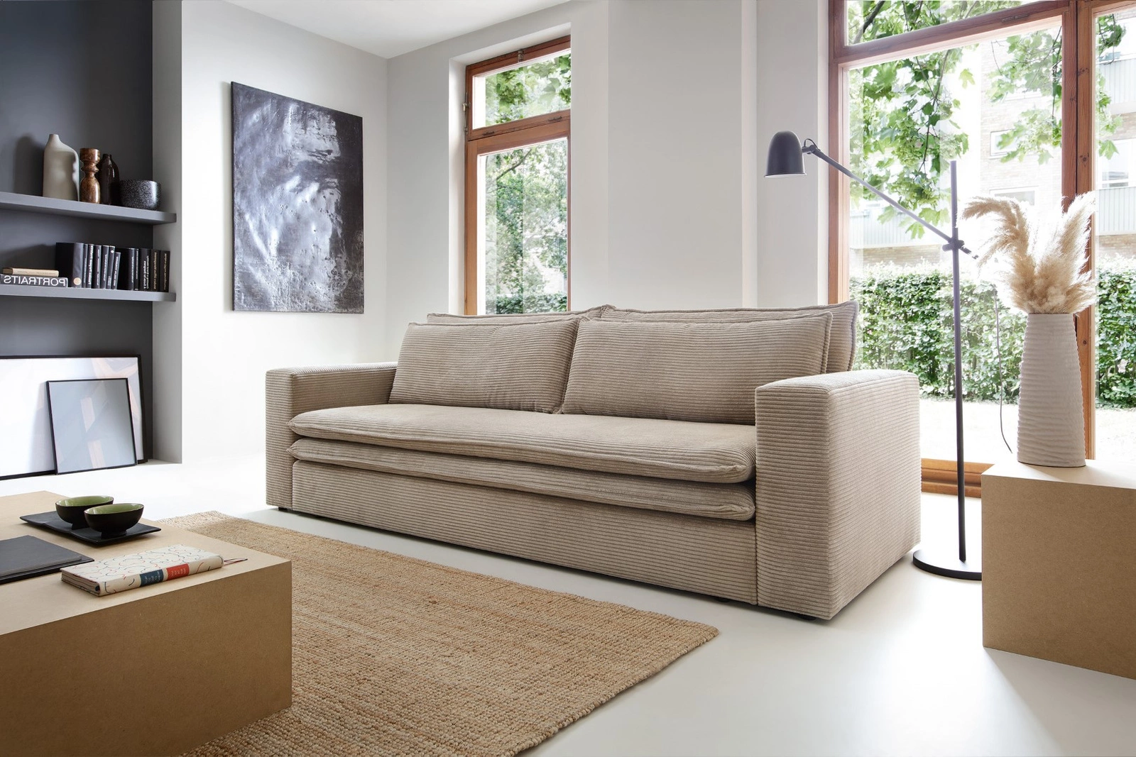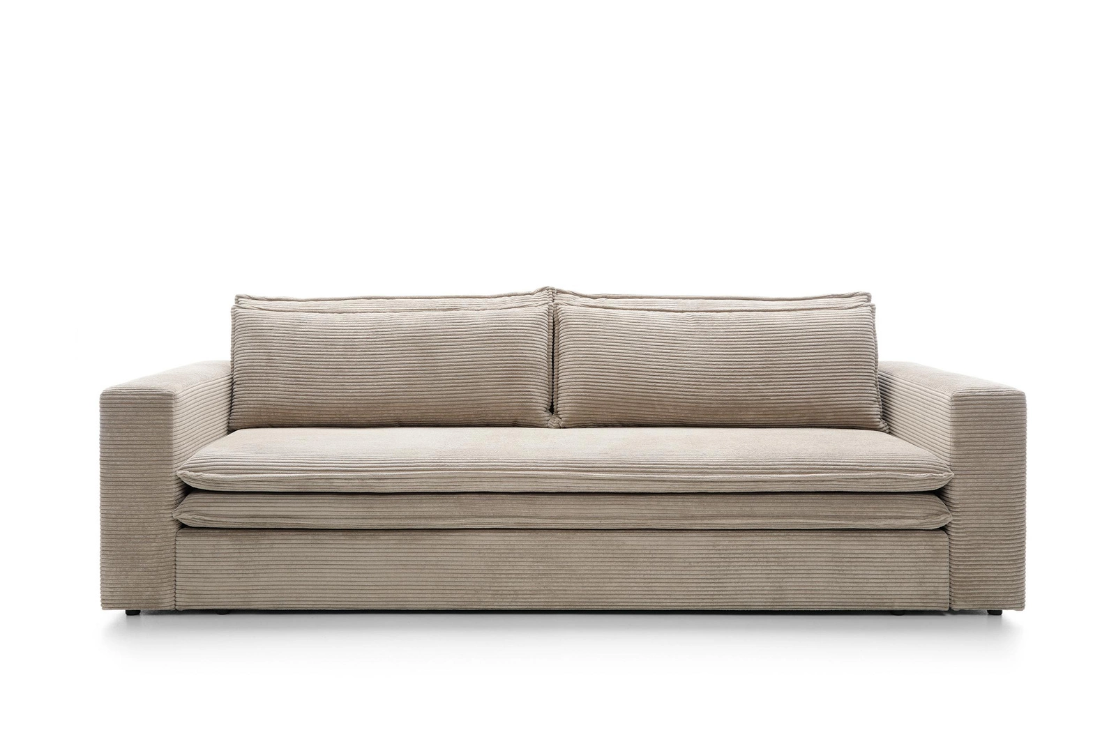 Sofa rozkładana Ulnes marki Intesi to trzyosobowa propozycja, która wnosi do salonu połączenie nowoczesnego komfortu i skandynawskiej przytulności. Miękka sztruksowa tkanina w odcieniu głębokiego beżu oraz aksamitne wykończenie sprawiają, że każdy kontakt z meblem to czysta przyjemność. Z szerokością 244 cm i dużą powierzchnią spania 200x140 cm, sofa zapewnia wygodę zarówno podczas spotkań rodzinnych, jak i codziennego odpoczynku.