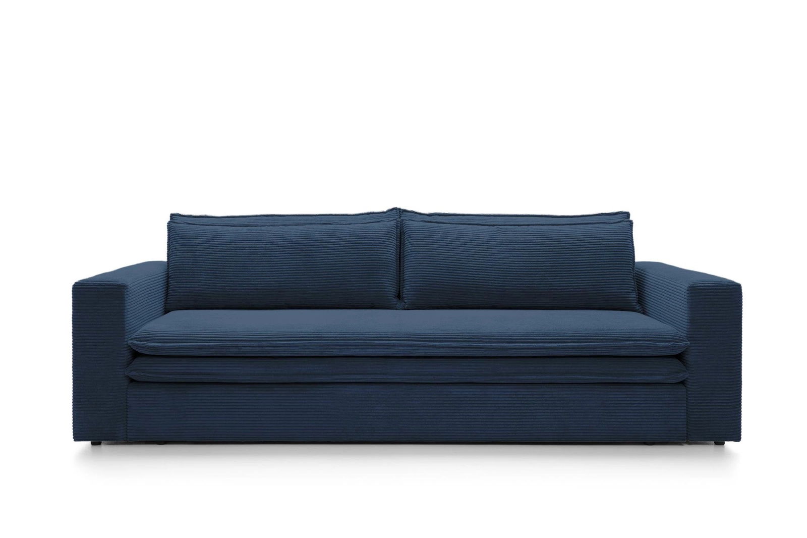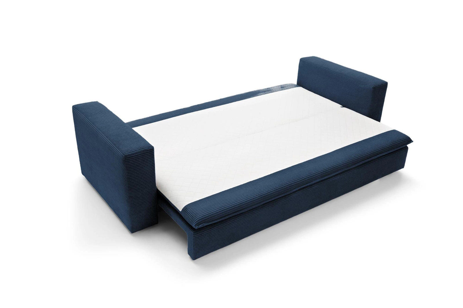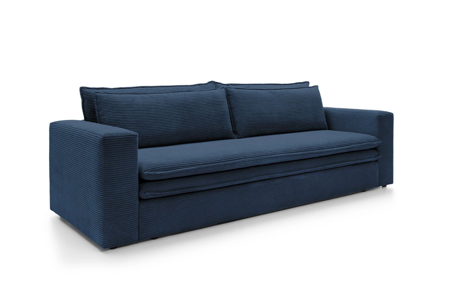 Sofa rozkładana Ulnes marki Intesi to połączenie wyrazistego designu i praktycznych rozwiązań, które idealnie wpisują się w potrzeby współczesnych wnętrz. Trzyosobowa kanapa z funkcją spania, tapicerowana miękką sztruksową tkaniną w głębokim granatowym kolorze, oferuje wygodne miejsce do siedzenia na co dzień i komfortowe łóżko o powierzchni 200×140 cm na noc. Pojemnik na pościel oraz zdejmowane poduszki zapewniają wygodę użytkowania i porządek w salonie lub pokoju młodzieżowym.