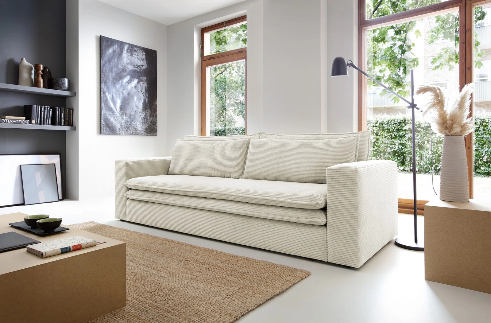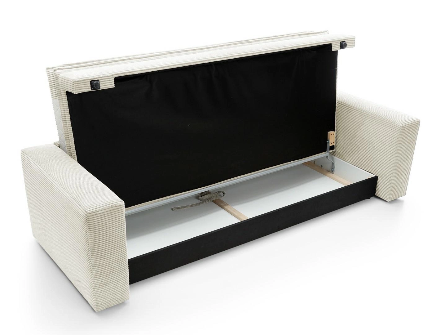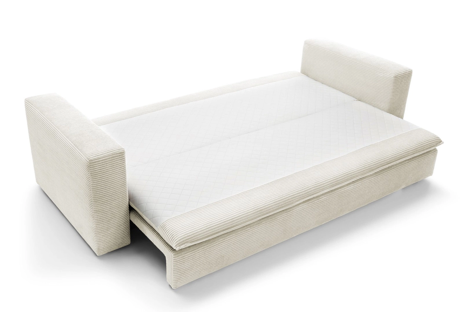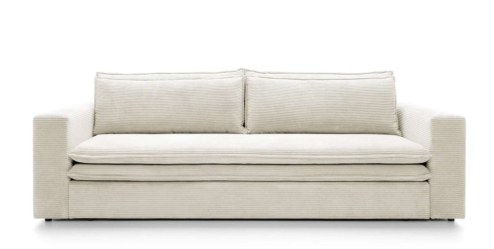 Sofa rozkładana z funkcją spania Ulnes marki Intesi to trzyosobowa, biała sofa sztruksowa stworzona z myślą o nowoczesnych i skandynawskich wnętrzach salonów oraz pokojów dziennych. Oferuje przestronną powierzchnię spania 200×140 cm, wygodne siedzisko na wysokości 43 cm oraz praktyczny pojemnik na pościel, który pozwala utrzymać porządek na co dzień. Wykończenie aksamitną tkaniną sztruksową zapewnia wyjątkową miękkość i niepowtarzalny wygląd, a stabilna, czarna podstawa na czterech nogach podkreśla jej lekki, współczesny charakter.