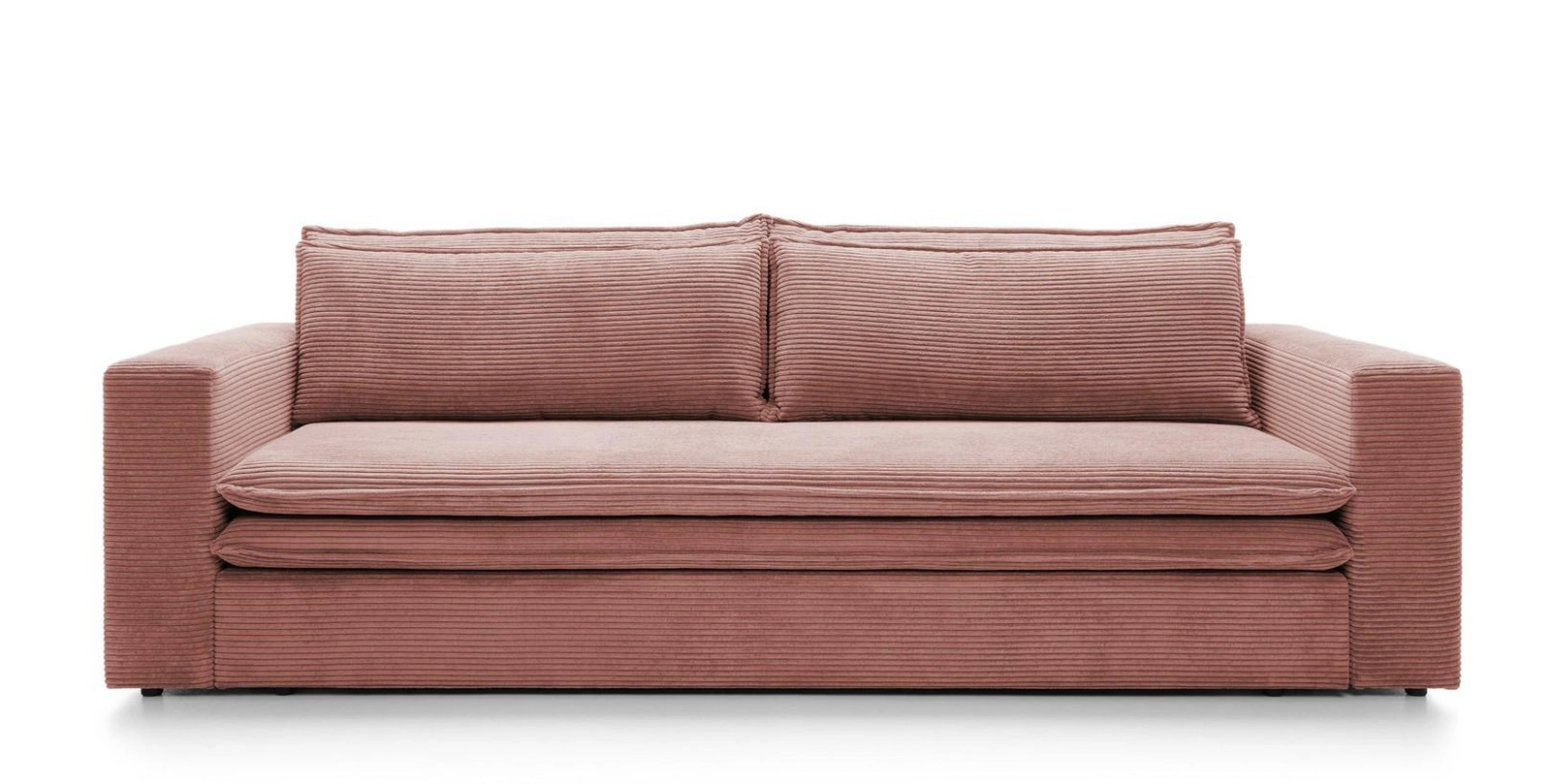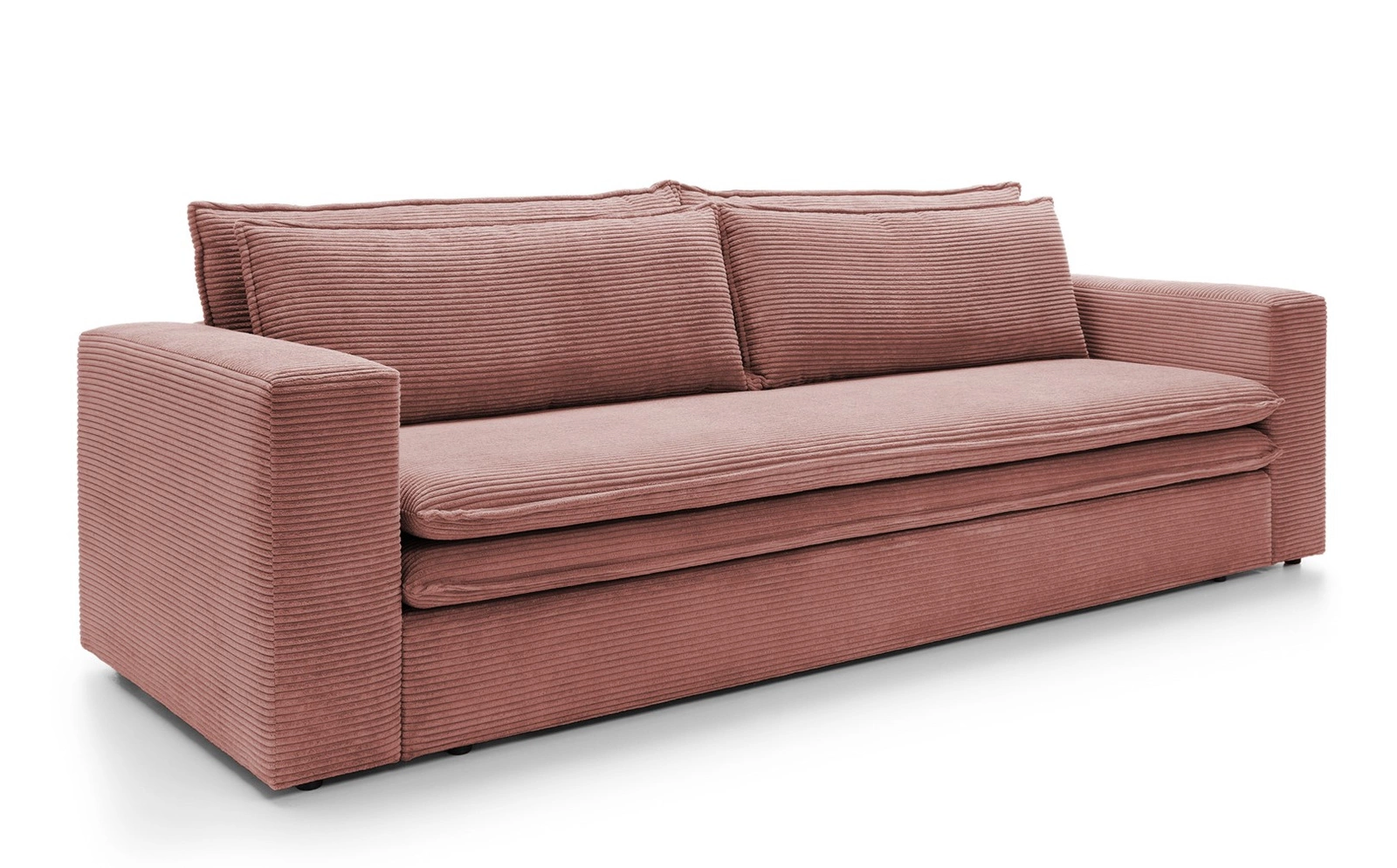 Ulnes to sofa rozkładana 3 osobowa, która doskonale wpisuje się w nowoczesne trendy aranżacyjne. Aksamitna, sztruksowa tapicerka w wyrazistym odcieniu różu przyciąga wzrok i dodaje wnętrzu energii, a jednocześnie wprowadza przytulny klimat. Wykończenie tkaniny zachwyca subtelną fakturą i miękkością, co sprawia, że codzienny relaks staje się prawdziwą przyjemnością. Dzięki minimalistycznej formie oraz czarnym, smukłym nóżkom sofa prezentuje się lekko i elegancko, stanowiąc nie tylko mebel użytkowy, ale i wyrazisty element dekoracyjny w salonie czy pokoju młodzieżowym.