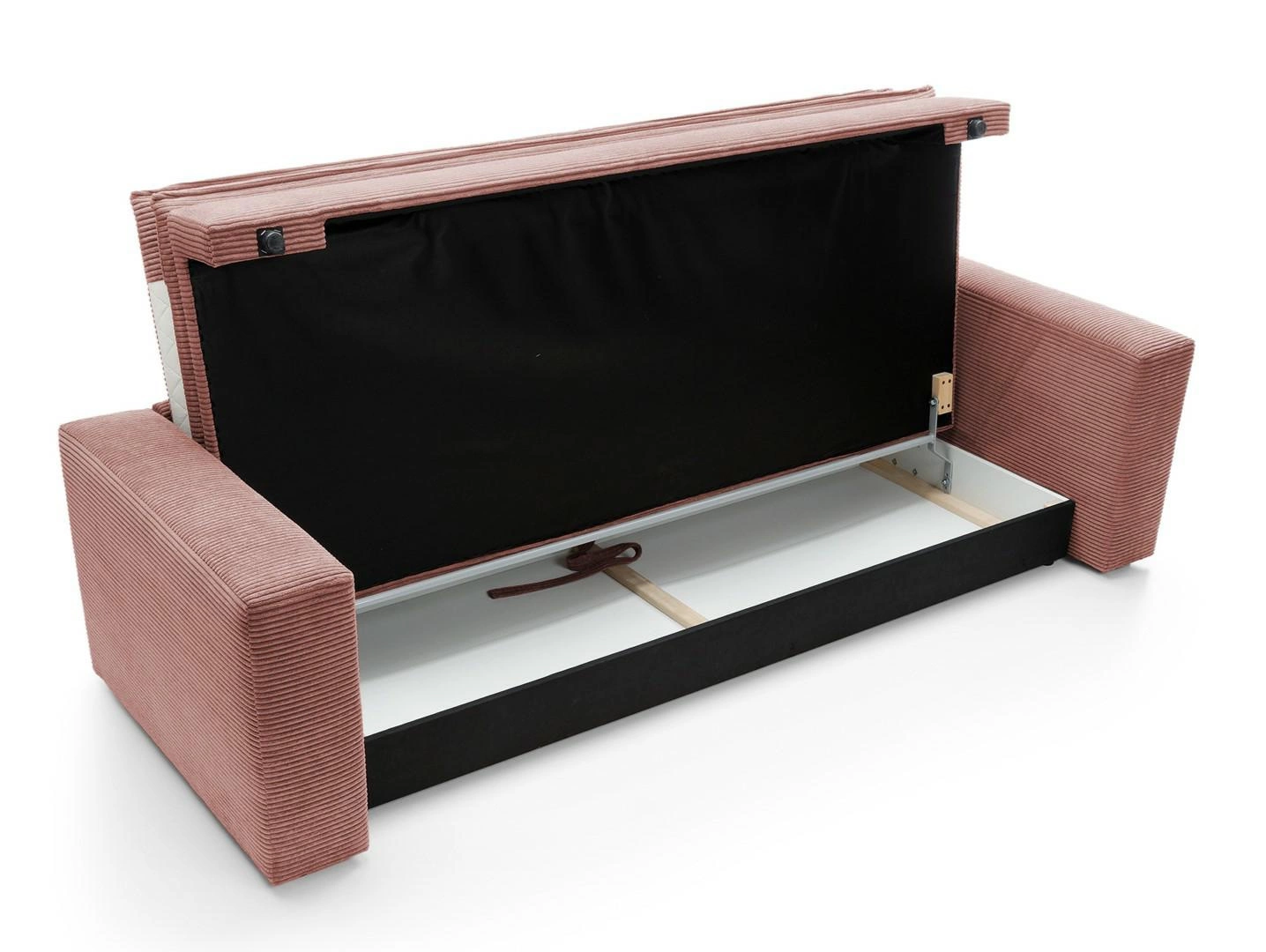 Sofa rozkładana z funkcją spania Ulnes marki Intesi to designerska, trzyosobowa sofa sztruksowa w modnym różowym kolorze, wyposażona w praktyczny pojemnik na pościel i wygodne, szerokie siedzisko o długości 244 cm. Zastosowanie miękkiej, aksamitnej tkaniny sztruksowej oraz wypełnienia z pianki tapicerskiej zapewnia wyjątkowy komfort zarówno podczas codziennego wypoczynku, jak i snu. Model Ulnes, z powierzchnią spania 200×140 cm, został stworzony z myślą o nowoczesnym salonie, gdzie liczy się styl, funkcjonalność i wygoda użytkowania.