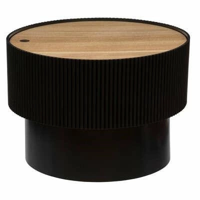 Okrągły stolik kawowy Enola L czarny | Atmosphera Okrągły stolik kawowy Enola od Atmosphery doda nowoczesnego, unikalnego akcentu do Twojej przestrzeni. Wykonany z wytrzymałej płyty MDF i wyposażony w fornirowany blat imitujący drewno, mebel jest idealny do małych wnętrz. Dodatkowo posiada otwór w blacie, który służy zarówno jako uchwyt, jak i tajne miejsce do przechowywania. Stwórz stylowy i szykowny wygląd ze stolikiem kawowym Enola! Wyjątkowy i nowoczesny mebel wniesie indywidualny styl do każdego pomieszczenia. Okrągła konstrukcja dodaje odrobinę współczesnej elegancji, a połączenie wąskiej, gładkiej części i szerszej części z delikatnym frezowaniem zapewnia ponadczasowy i trwały urok. Solidna płyta MDF jest bardzo wytrzymała i jest dodatkowo uzupełniona blatem z okleiną imitującą drewno. Dzięki otworowi w blacie, który działa jak uchwyt, można podnieść blat i przechowywać w stoliku rozmaite przedmioty. Idealny do dodania oszałamiającego akcentu do każdego małego wnętrza, stolik kawowy Enola jest niezbędnym elementem, który bez wysiłku wzbogaci każde pomieszczenie. O tym warto pamiętać! Unikalny design tworzy nowoczesny i stylowy wygląd pasujący do każdego domu Trwałe materiały zapewniają długotrwałe użytkowanie Ukryty schowek zapewnia dodatkową wartość funkcjonalną