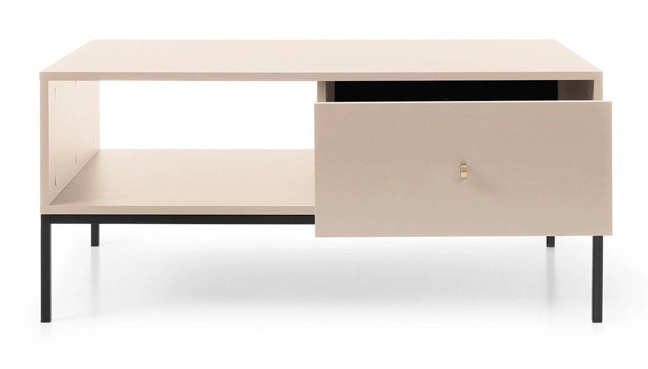 Minimalistyczny stolik na wysokich nogach to mebel dla bardzo wymagających użytkowników. Stolik o gładkim frontcie szuflady i klasycznym kształcie pozwoli na aranżacje nawet najbardziej wymagającego wnętrza. Uchwyt w kształcie pastylki, zrobiony został z aluminium i jest nie tylko elementem do odsuwania szuflady ale również ciekawym, designerskim akcentem. Podstawą stolika są wysokie nóżki, które ułatwiają wjechanie pod komodę robotom sprzątającym. Pakowny oraz elegancki stolik to rozwiązanie nie tylko do wnętrz nowoczesnych. Stolik pięknie prezentować się będzie również we wnętrzu boho lub nawet eklektycznym. Wymiary opakowania: 100x22x6cm, 100X72X7cm, Waga: 4kg i 27kg