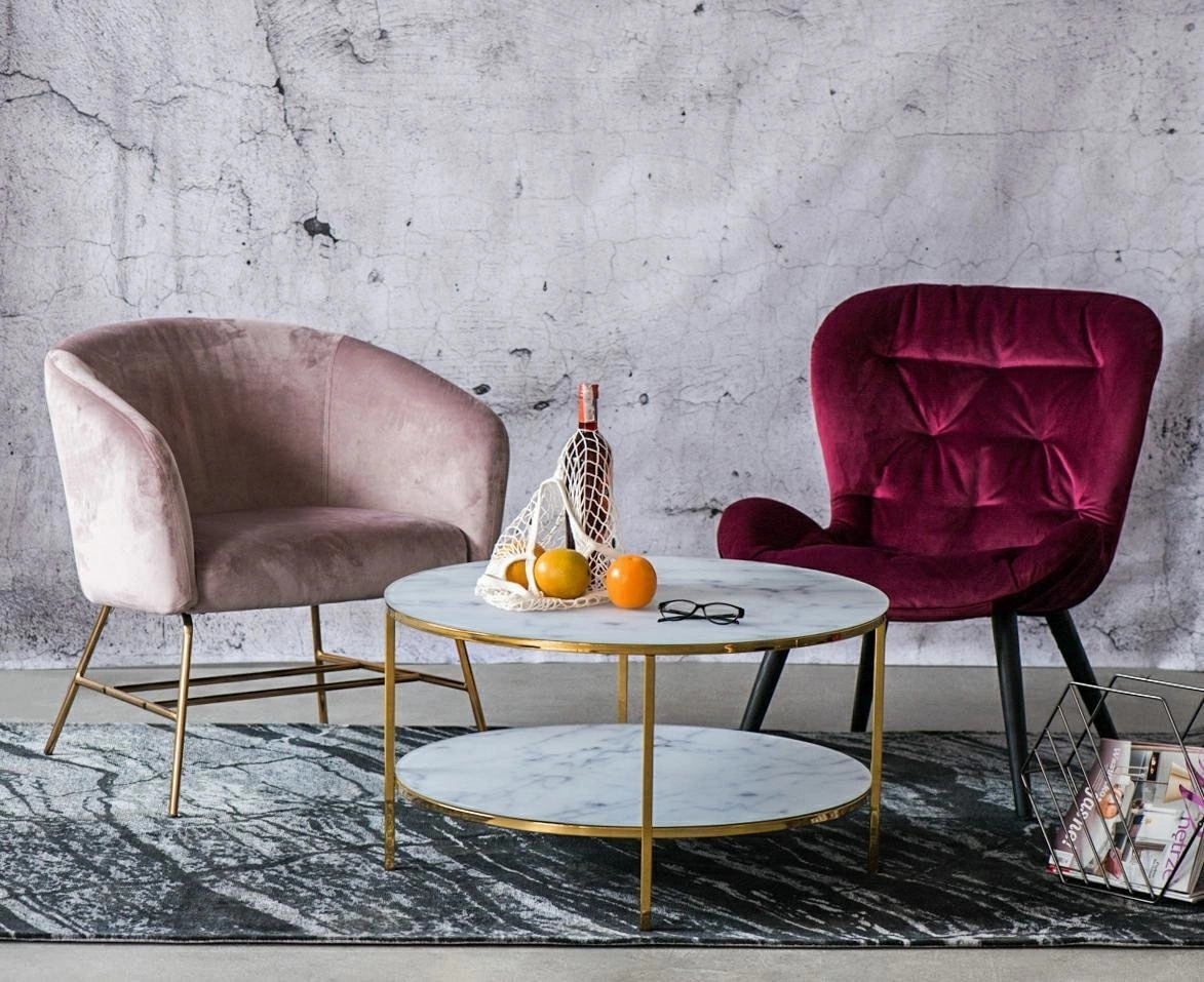 Stolik Alisma okrągły z półką wykonany został ze szkła połączonego ze złotą metalową podstawą. Geometria wraz z marmurowym wykończeniem to wpisujący się w trendy nowoczesny design. Szklany blat o grubości 6mm jest wytrzymały i solidny.