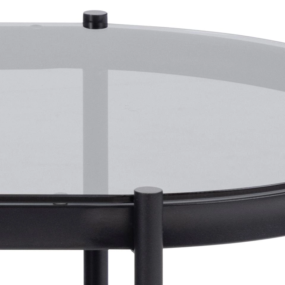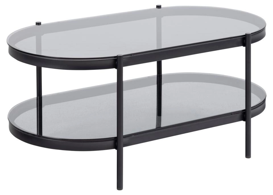 Stolik posiada duży, owalny blat z dymionego szkła oraz półkę wykonaną z tego samego materiału. Jej szkielet to malowany proszkowo metal w kolorze czarnym. Dwie półki o szerokości 95 cm pozwolą ci postawić na nim wiele rzeczy. To idealne miejsce na wazon z kwiatami, kubek kawy czy ulubione czasopisma. Czarny kolor Bayonne będzie idealnie współgrał z żywymi kwiatami. Dobierz także konsole z tej samej serii i w jednolity sposób urządź swoje pomieszczenie.