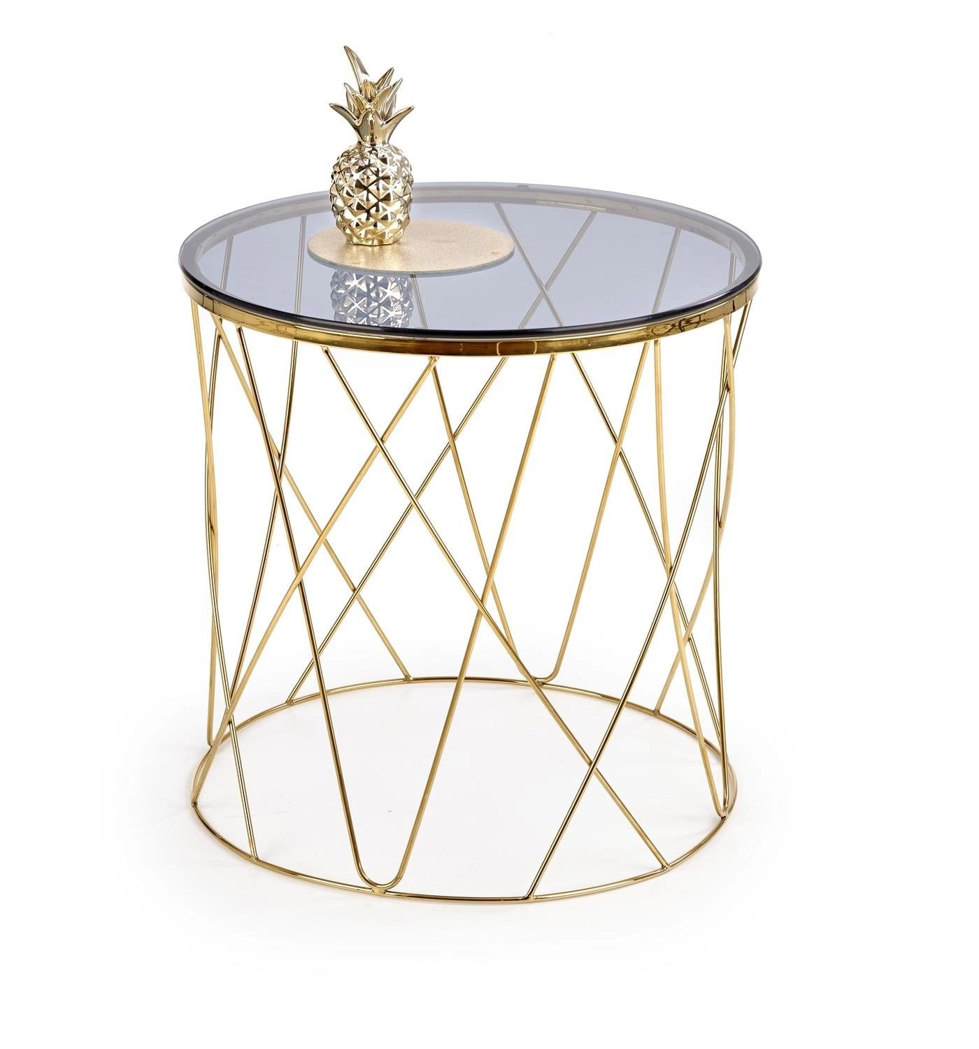 Wymiary 55/55 cm nadają stolikowi intymny, zachęcający charakter, który zachęca do zajęcia miejsca i relaksu. Przydymione szkło jest zabarwione na subtelny odcień szarości, dzięki czemu jego błyszczący połysk pięknie odbija światło, a złota podstawa idealnie kontrastuje z blatem.