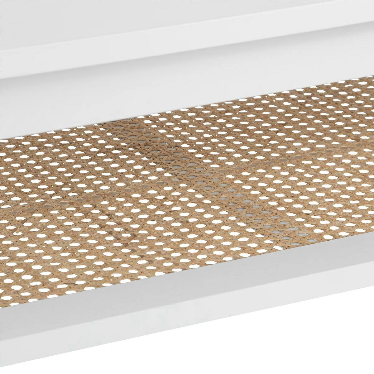 Stolik kawowy Cabras to elegancki i funkcjonalny mebel, który świetnie sprawdzi się w każdym nowoczesnym salonie. Wykonany z płyty pilśniowej w białej okleinie oraz malowanego drewna kauczukowego, łączy w sobie nowoczesny design z praktycznością. Jego prostokątny kształt zapewnia dużo miejsca do przechowywania codziennych przedmiotów, takich jak piloty, filiżanki czy książki. Dodatkowym atutem stolika jest dolna półka ozdobiona rattanową trzciną, która nadaje całości lekkości i naturalnego uroku.