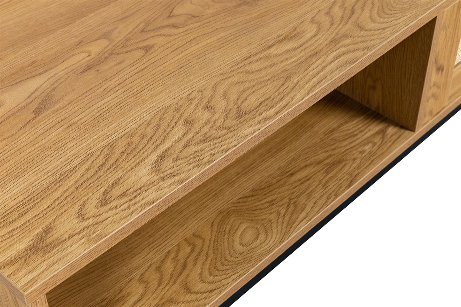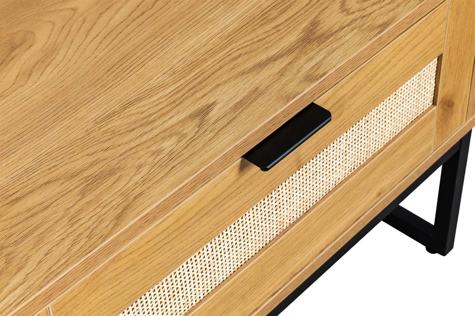 Ten piękny stolik kawowy Capri w stylu boho z rattanowymi frontami to idealny mebel do sypialni lub salonu w naturalnych, jasnych kolorach. Stolik stoi stabilnie dzięki metalowej podstawie. Nogi stolika Capri zostały pomalowane proszkowo na kolor czarny. Okleina o princie dębowy, która została użyta do wykończenia mebla, niezwykle dokładnie imituje fakturę naturalnego drewna.