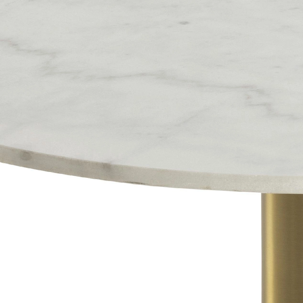 Okrągły stolik kawowy Corby to kwintesencja stylu glamour. Okrągły blat z białego marmuru idealnie komponuje się z metalową szczotkowaną podstawą w kolorze złotym. Stolik oparty jest na jednej grubej okrągłej nodze na okrągłej podstawie. Ze względu na kamienny blat stolik waży 62,7 kg. Będzie idealnym dopełnieniem modnych i eleganckich wnętrz.