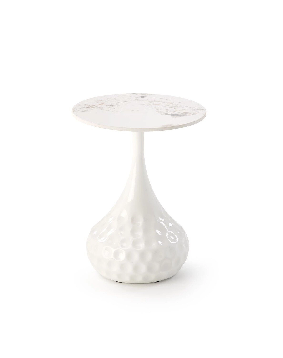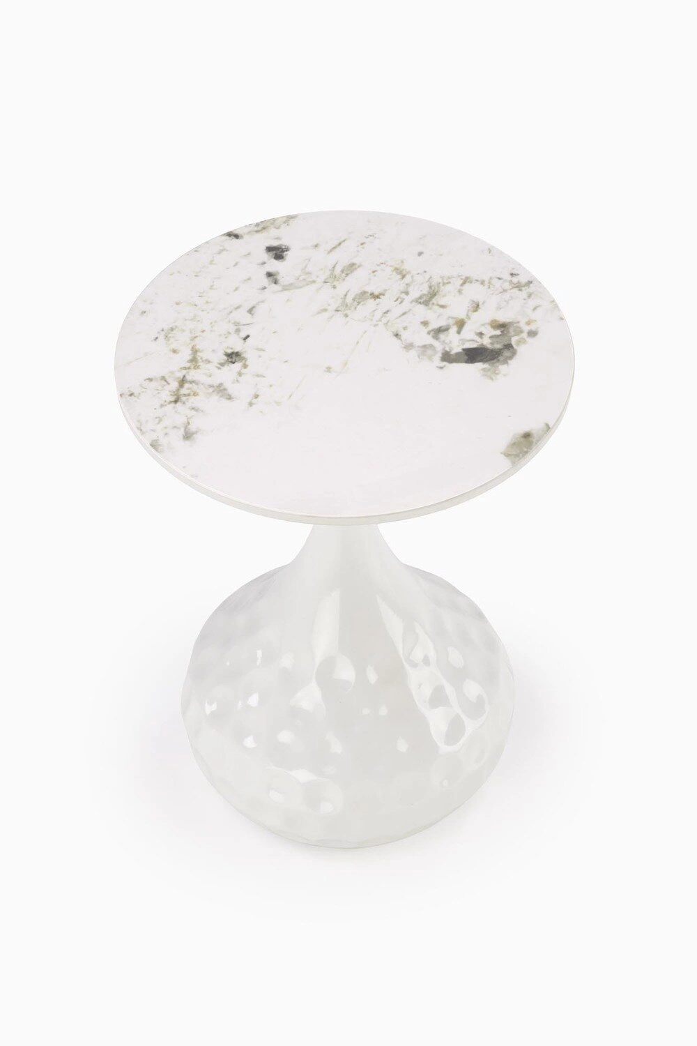 Stolik kawowy Drayden w kolorze białego marmuru z białą stalową podstawą to elegancki i nowoczesny mebel, który wprowadza do wnętrza subtelny luksus. Jego kompaktowe wymiary (40 cm średnicy i 52 cm wysokości) sprawiają, że doskonale sprawdzi się zarówno jako stolik kawowy, jak i pomocniczy w salonie, sypialni czy gabinecie. Blat wykonany ze spieku kwarcowego w kolorze białego marmuru nadaje meblowi wyjątkowy, luksusowy wygląd, jednocześnie będąc bardzo trwałym i odpornym na codzienne użytkowanie.
