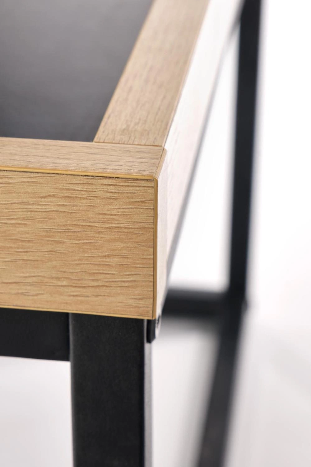 Jego wymiary (100/60/39 cm) sprawiają, że jest idealnie dopasowany do różnych przestrzeni. Blat wykonany z płyty meblowej okleinowanej prezentuje się niezwykle elegancko i posiada obrzeża wykończone w kolorze naturalnego drewna. Kolorystyka blatu to połączenie czerni i naturalnego drewna, co nadaje mu nowoczesnego charakteru. Materiał ten jest nie tylko trwały, ale także łatwy do utrzymania w czystości, co jest niezwykle istotne w przypadku mebli codziennego użytku.