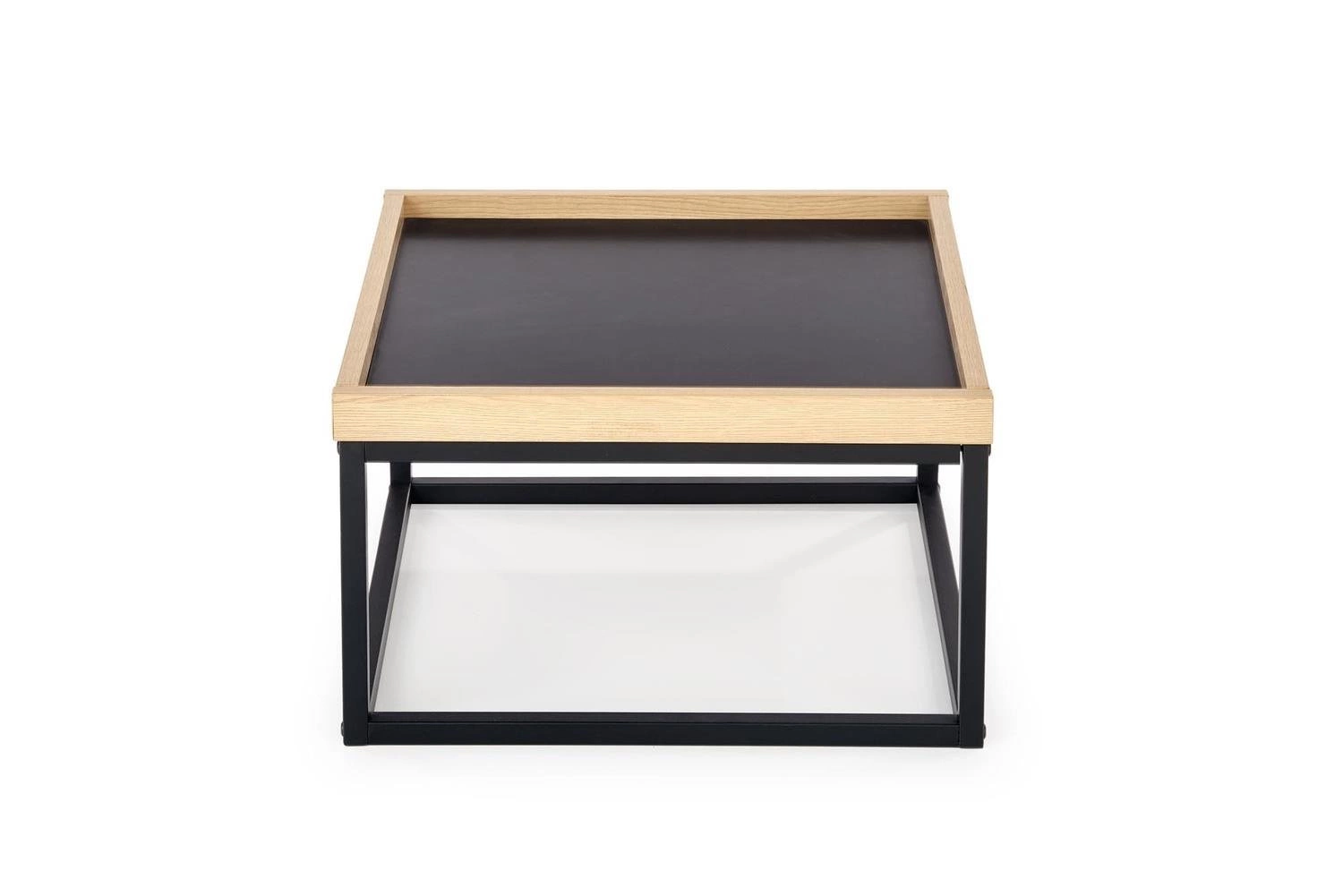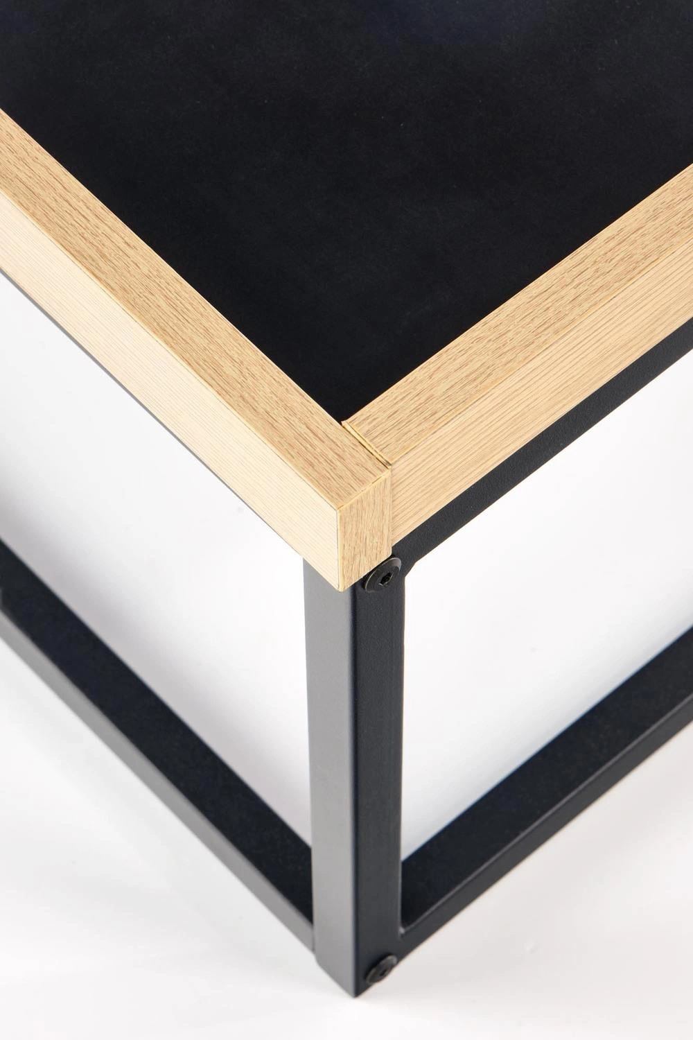 Jego wymiary (53/53/30 cm) sprawiają, że jest idealnie dopasowany do różnych przestrzeni. Blat wykonany z płyty meblowej okleinowanej prezentuje się niezwykle elegancko i posiada obrzeża wykończone w kolorze naturalnego drewna. Kolorystyka blatu to połączenie czerni i naturalnego drewna, co nadaje mu nowoczesnego charakteru. Materiał ten jest nie tylko trwały, ale także łatwy do utrzymania w czystości, co jest niezwykle istotne w przypadku mebli codziennego użytku.