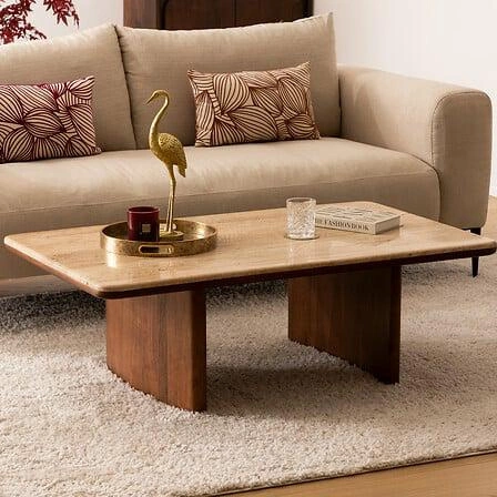 Stolik kawowy Jivan marki Atmosphera zachwyca surowcem najwyższej klasy, łącząc trawertynowy blat i drewno akacjowe w spójną, elegancką całość. Prostokątny blat, wykończony w półmacie, jest nie tylko efektowny wizualnie – jego pokrycie żywicą sprawia, że jest odporny na wilgoć i plamy, dzięki czemu z łatwością utrzymasz go w nienagannej czystości. Naturalny rysunek kamienia oraz subtelny odcień drewna tworzą nowoczesny, a zarazem przytulny akcent w każdym wnętrzu.Funkcjonalny stolik kawowy do salonu – wszechstronność na co dzień