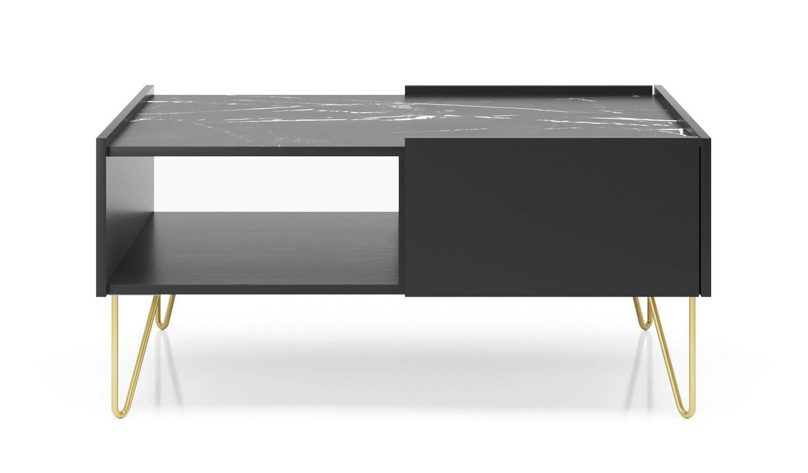 Czarny stolik kawowy Marbren ma elegancki wygląd, który będzie uzupełnieniem każdego nowoczesnego salonu. Posiada czarny blat imitujący marmur, metalowe nogi w kolorze złota oraz głęboką szufladę do przechowywania. Stolik to jeden element kolekcji Marbren, kup inne meble z tej samej serii i urządź swój dom w jednolitym stylu!