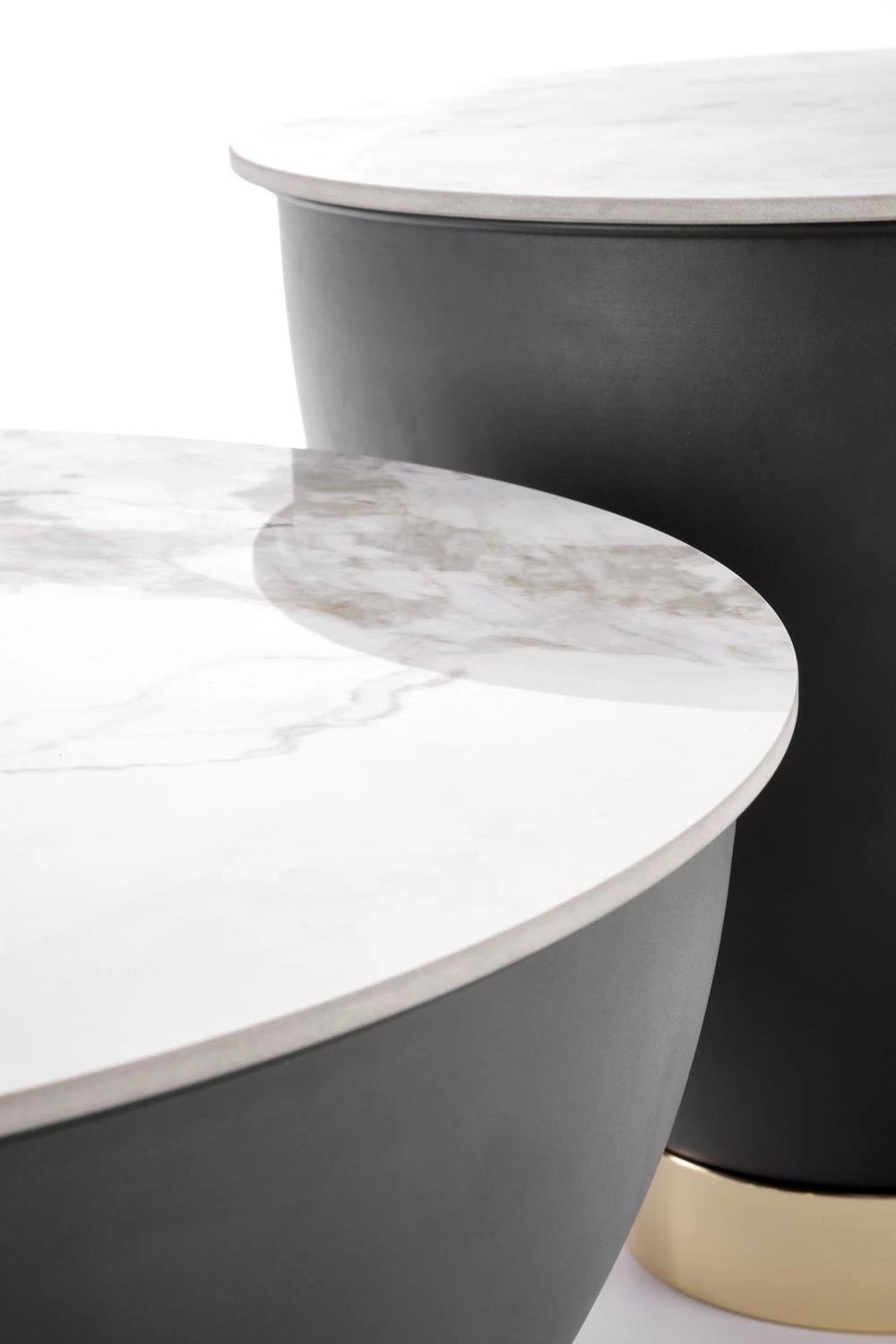 Materiały użyte do produkcji Stolika kawowego Moonshine to ceramika oraz stal malowana proszkowo, które tworzą harmonijną i stylową kompozycję. Kolorystyka biały marmur - popielaty - złoty dodaje meblowi wyrafinowanego wyglądu, idealnego zarówno dla salonu w stylu glamour, jak i nowoczesnego biura.