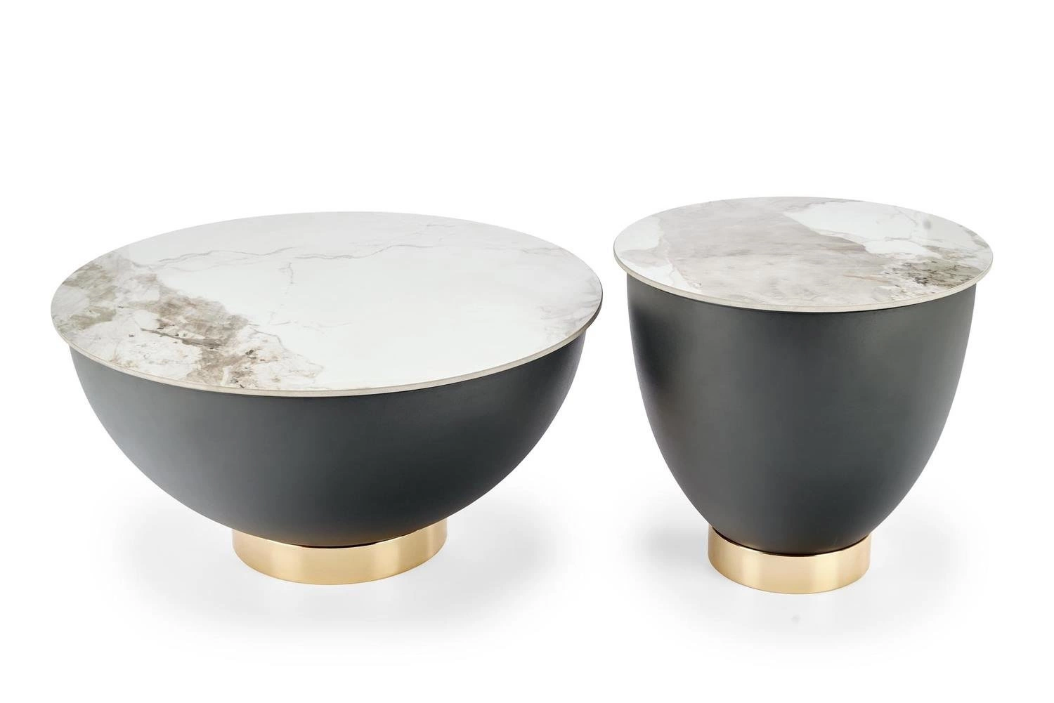 Stelaż wykonany z metalu gwarantuje stabilność i wytrzymałość mebla. Jego złoty i popielaty kolor doskonale współgra z kolorami blatu, tworząc spójną całość. Stolik kawowy Moonshine posiada okrągły blat z ceramiki, który nadaje mu wyjątkowego uroku i oryginalności.
