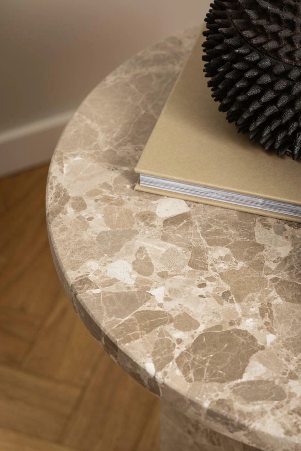 Blat i podstawa stolika wykonane są w całości z marmuru, co sprawia, że każdy egzemplarz jest unikalny. Naturalne różnice w kolorze, powierzchni i strukturze kamienia dodają indywidualnego charakteru, co czyni go wyjątkowym elementem wnętrza.