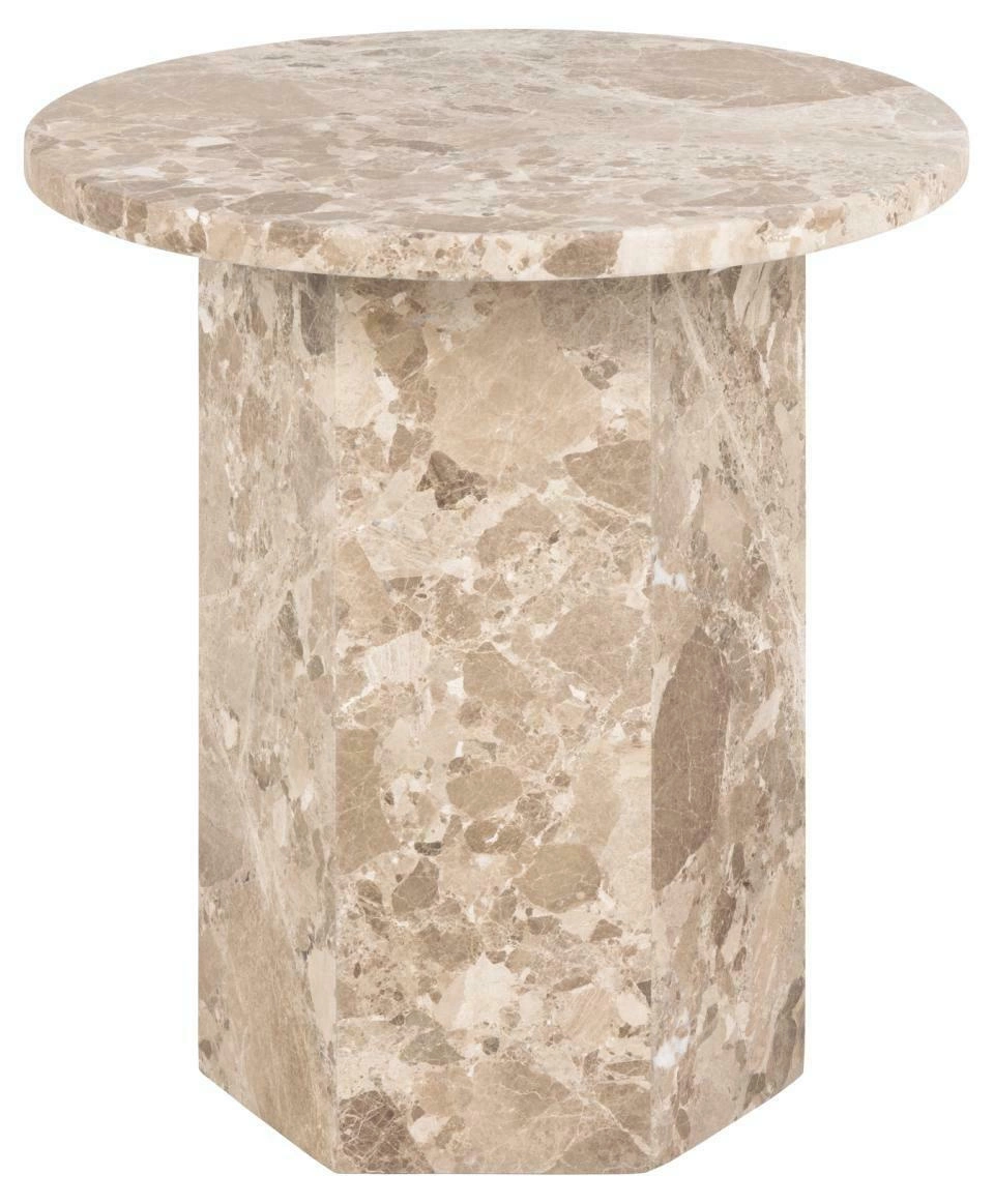Sześciokątna podstawa filaru zapewnia solidną i stabilną konstrukcję, jednocześnie podkreślając surowe, naturalne piękno materiału. Stolik Naxos to idealne połączenie elegancji i trwałości.