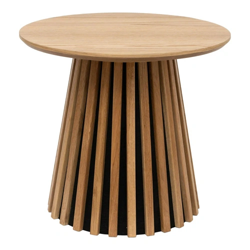 Okrągły stolik kawowy Osaka doskonale wpisuje się w modne wnętrza skandynawskie i rustykalne. Naturalny odcień dębu ociepla przestrzeń i świetnie komponuje się z jasną sofą, szarą kanapą czy fotelami w stylu boho. Smukła, pojedyncza noga w kolorze naturalnego dębu sprawia, że stolik wizualnie zajmuje mało miejsca, dzięki czemu idealnie sprawdzi się w małych salonach, kawalerkach czy jako stolik boczny przy fotelu do czytania. Matowe wykończenie blatu eliminuje refleksy światła i nadaje meblowi elegancki, stonowany charakter.Funkcjonalny mały stolik kawowy – idealny jako stolik pomocniczy