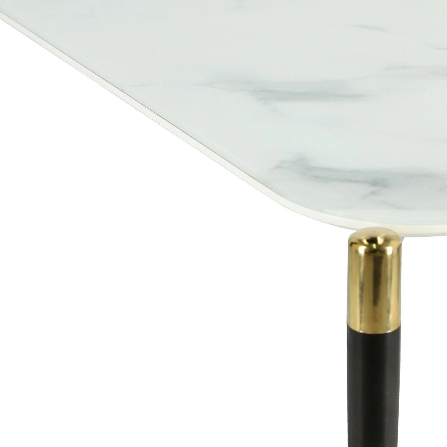Stolik Pista to kwintesencja stylu glamour. Doskonale wkomponowują się we wnętrza pełne blasku, eleganckich mebli czy ekskluzywnych dodatków. Szklany blat o grubości 10 mm został pomalowany od spodu we wzór imitujący marmur. Blat został od spodu wzmocniony płytą MDF o ciekawie zakończonym brzegu. Czarne nóżki i podpora wykonane z metalu gwarantują stabilność i wytrzymałość. Zakończenia nóżek stolika ozdobione zostały metalową złotą nakładką, która dodaje stolikowi blichtru. Zestawienie marmurowego wzoru oraz złotego i czarnego koloru daje wrażenie luksusowego przedmioty, który z pewnością ozdobi Twój salon, dodając mu klasy i szyku.