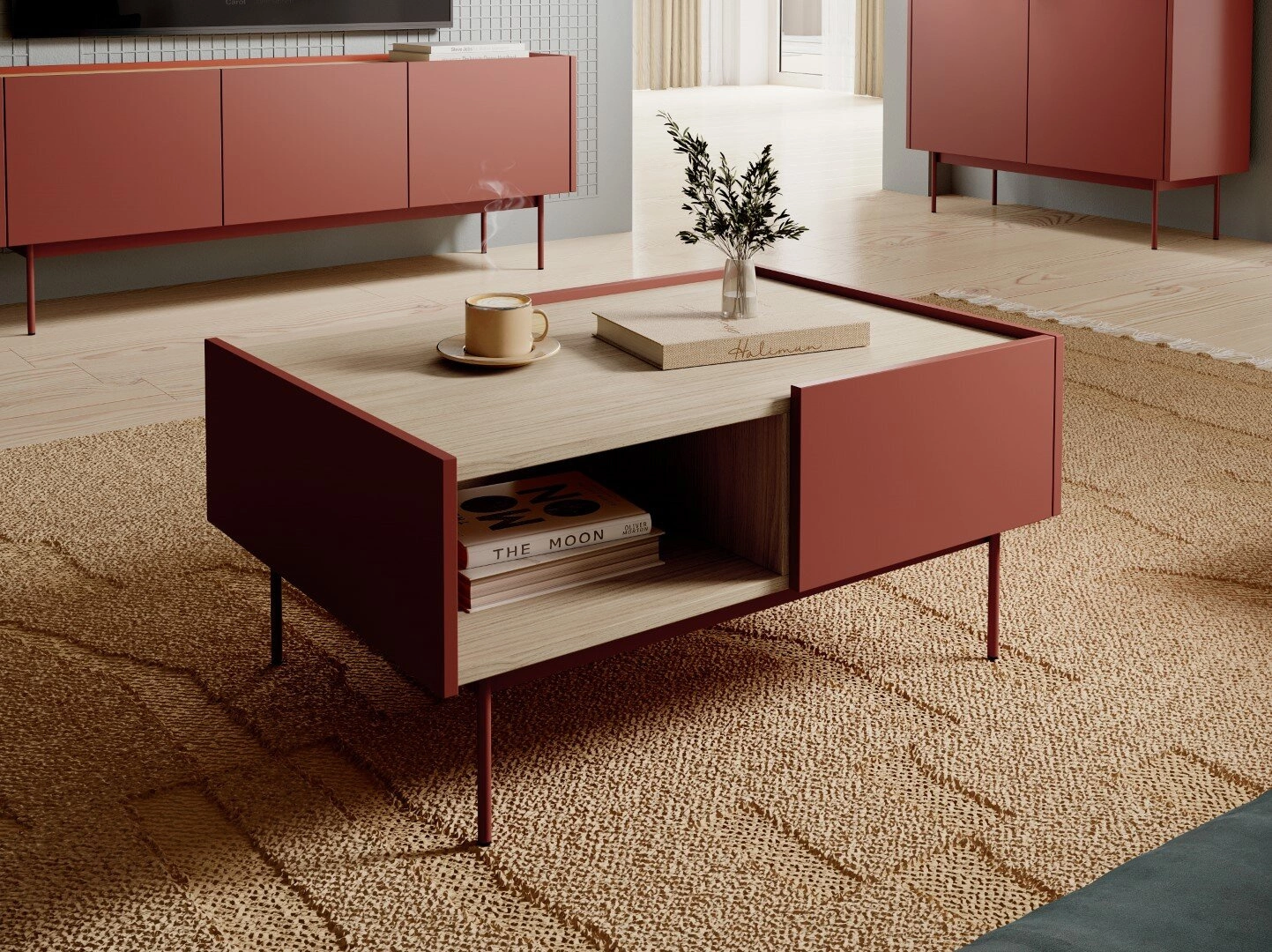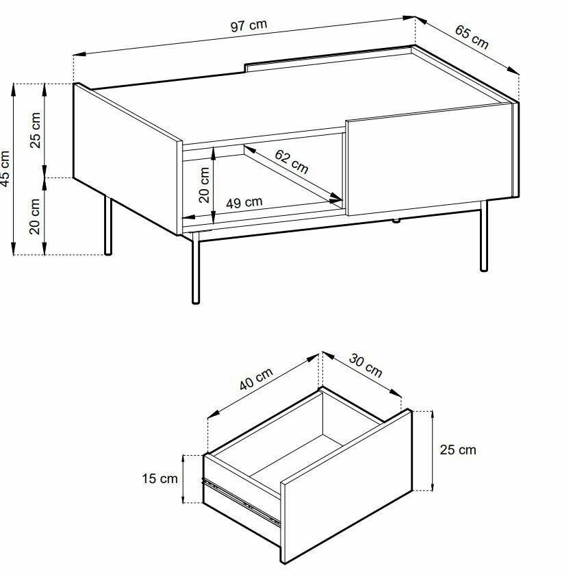 Mebel został stworzony z myślą o prostocie formy i używania. Dwie szuflady oraz półka, zapewnia dużo miejsca na różne urządzenia. Korpus i fronty wykonane są z płyty, a dodatkowe obrzeże ABS nadaje im trwałość i elegancję. Cashmer posiada metalowe nogi o wysokości 20cm, która dodaje mu lekkości i subtelności. Zawiera system otwierania poprzez wysuniętą krawędź oraz prowadnica kulkowa z pełnym wysuwem, dzięki czemu korzystanie jest niezwykle wygodne i wygodne. Maksymalne obciążenie blatu wynosi 30 kg. Stolik kawowy jest elementem kolekcji mebli Cashmer, dzięki czemu możesz stworzyć spójne wnętrze.