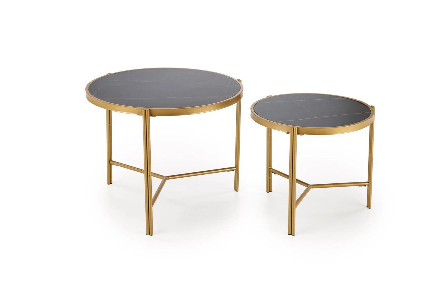 - Stoliki wykonane są z trwałego spieku w kolorze czarnego marmuru, z podstawą z proszkowo malowanej stali w kolorze złotym