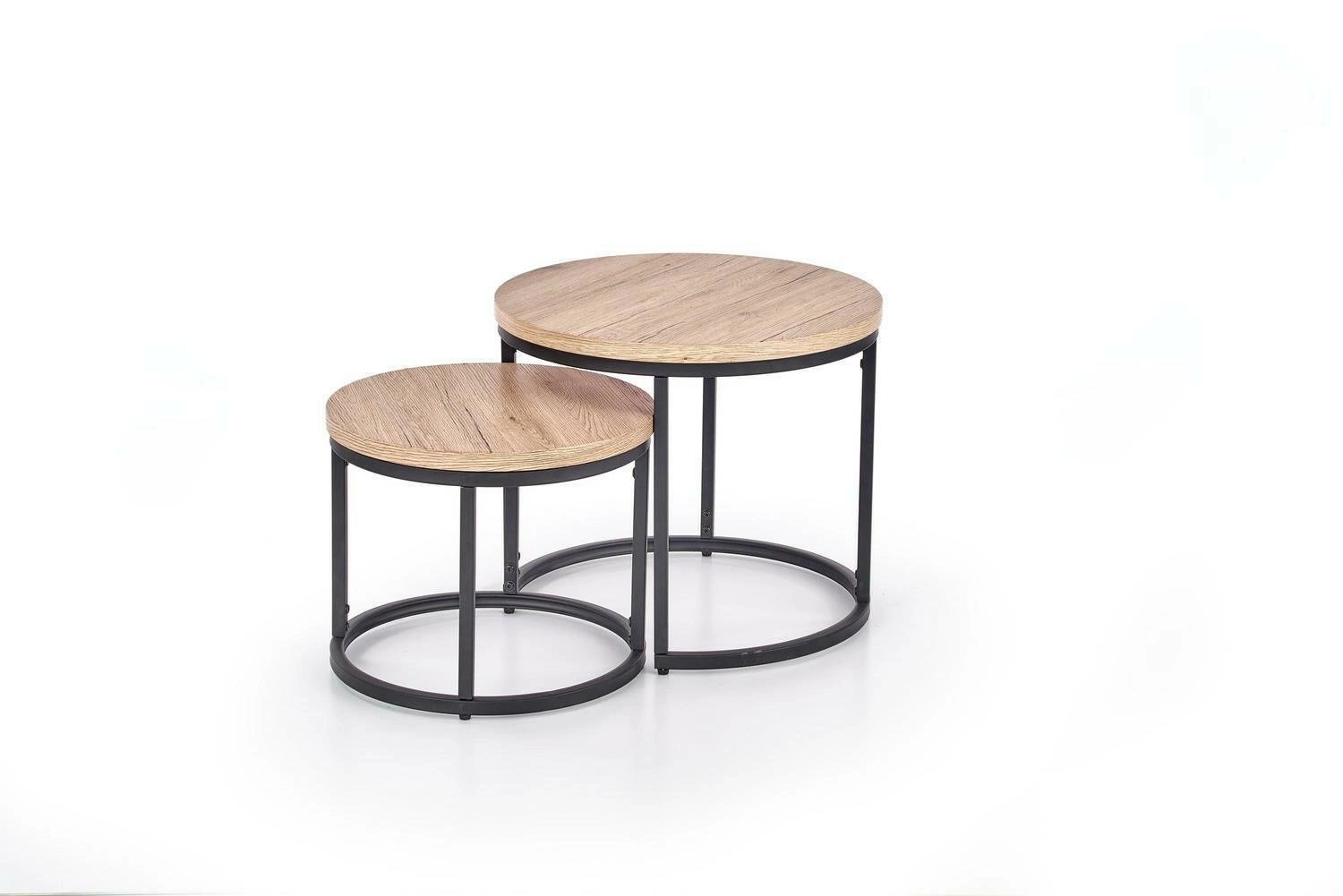 Stwórz idealne warunki do rozrywki w domu dzięki temu nowoczesnemu zestawowi 2 stolików Tabarka w stylu loftowym. Malowane proszkowo stalowe ramy i naturalne dębowe blaty z fornirowanej płyty MDF dodadzą śmiałości Twojej przestrzeni życiowej.
