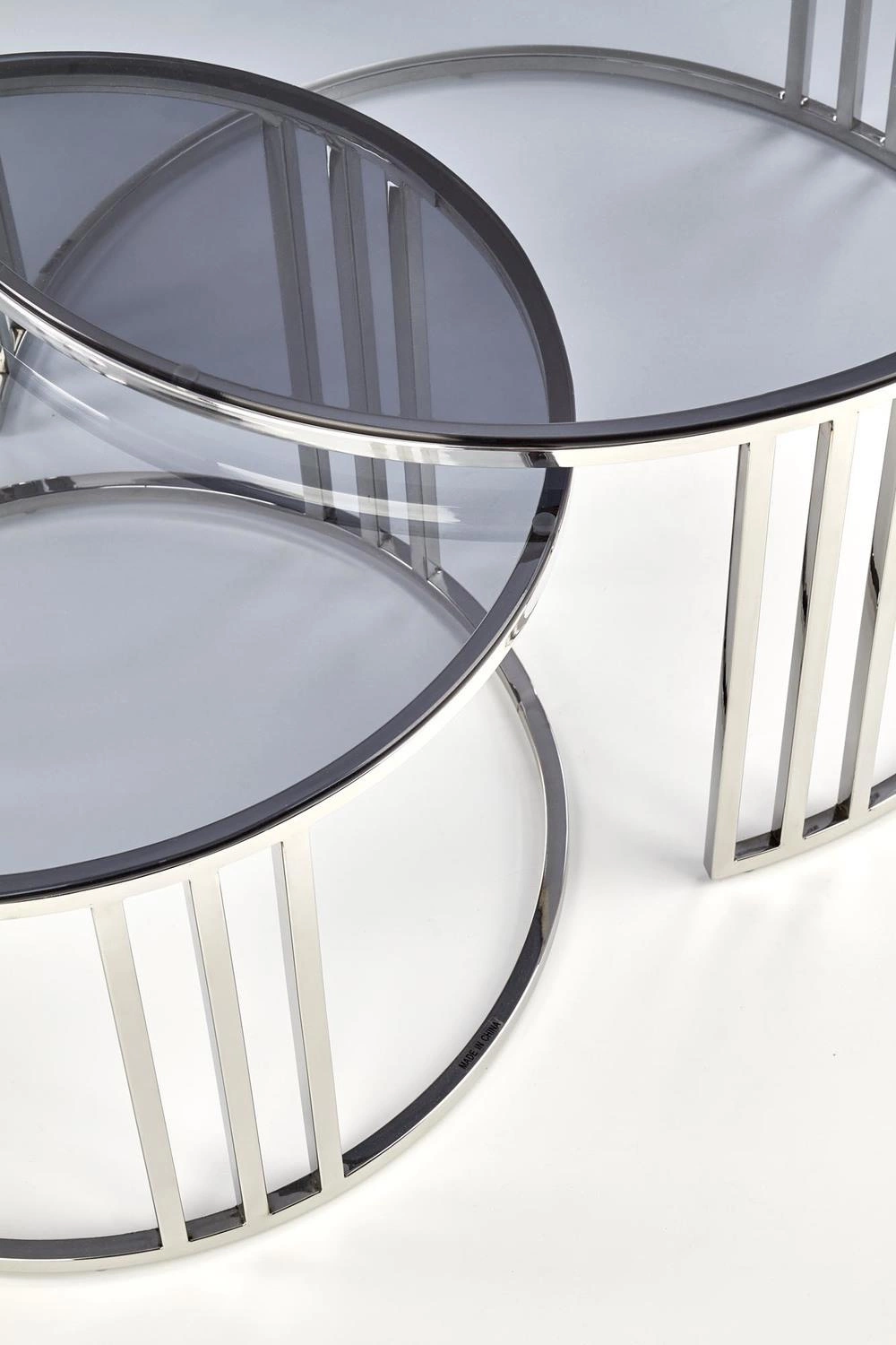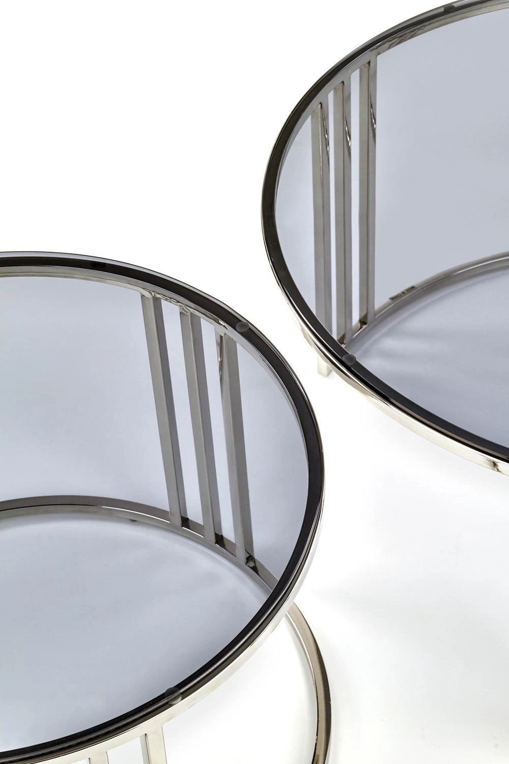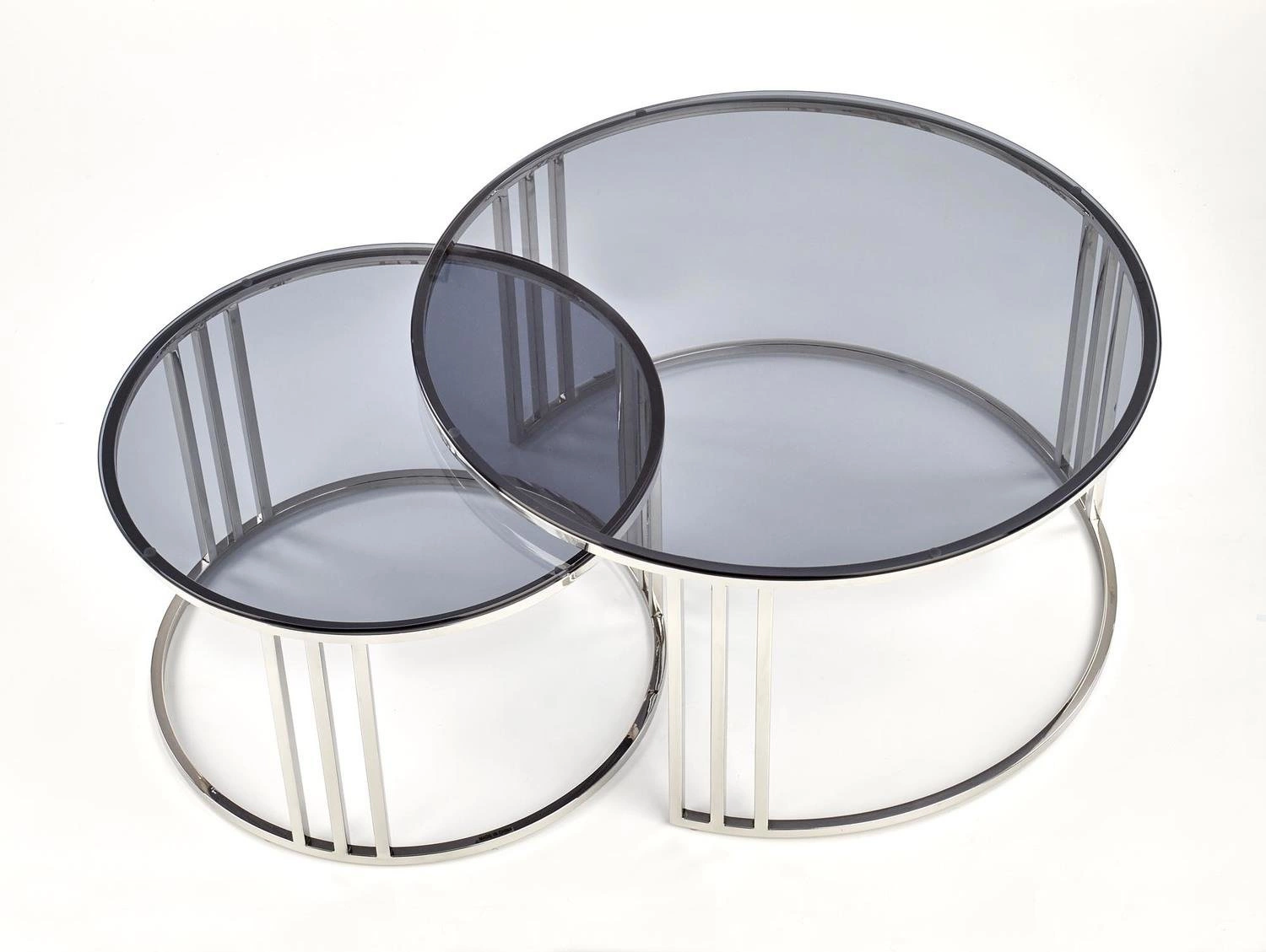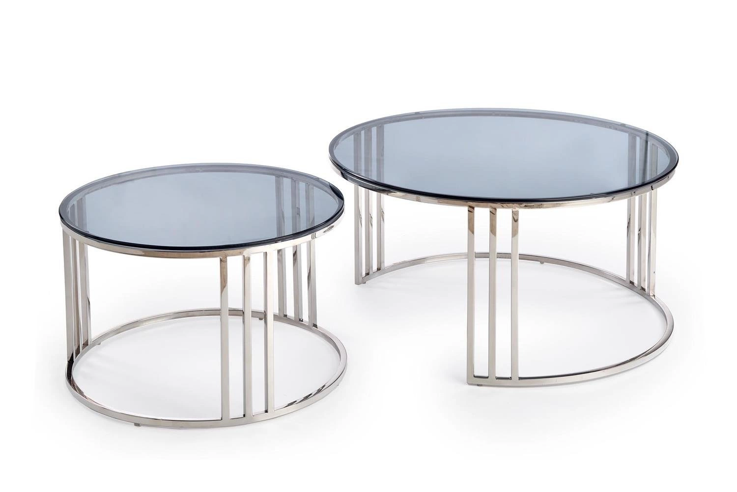 Uzyskaj nowoczesny, klasyczny wygląd w stylu glamour dzięki zestawowi 2 stolików Yasmine. Konstrukcja z szkła i stali nierdzewnej będzie oszałamiającym dodatkiem do każdego pomieszczenia w domu. Wymiary obu stolików to: średnica 80 cm, wysokość 45 cm i średnica 60 cm, wysokość 38 cm.