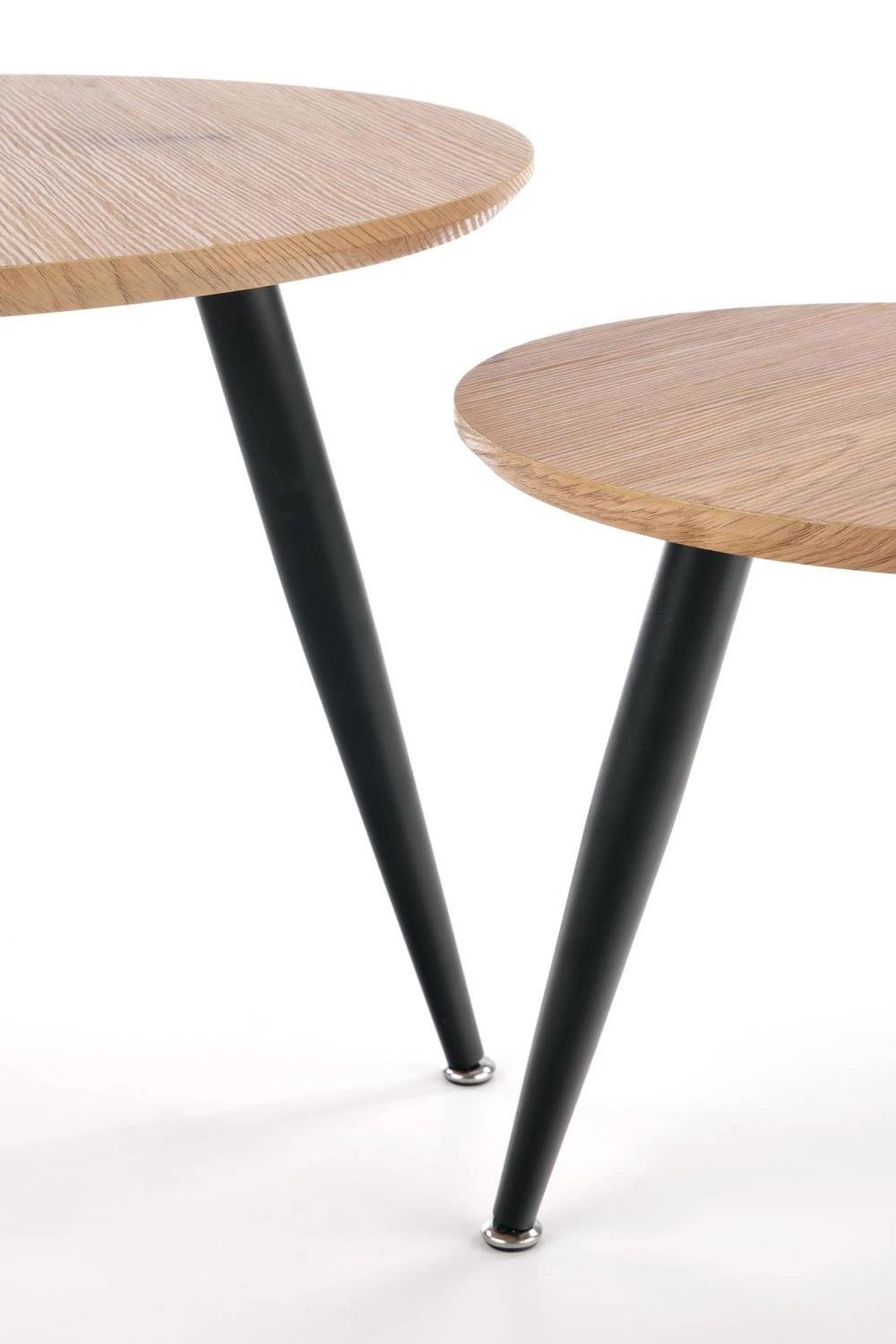 Kolorystyka tych stolików to dąb złoty i czarny, co idealnie wpisuje się w trendy loftowego i skandynawskiego stylu. Dzięki temu, zestaw ten będzie doskonale komponować się z innymi elementami Twojego wnętrza, dodając mu niepowtarzalnego charakteru.Stelaż tych stolików został wykonany z metalu, co zapewnia im stabilność i solidność. Dodatkowo, stal malowana proszkowo gwarantuje odporność na uszkodzenia i zarysowania. Możesz być pewien, że te stoliki będą służyć Ci przez wiele lat, nie tracąc swojego uroku. Blat tych stolików ma kształt okrągły, co sprawia, że są one nie tylko praktyczne, ale także estetyczne. Blat wykonany jest z MDF okleinowanego, co daje efekt naturalnego drewna.