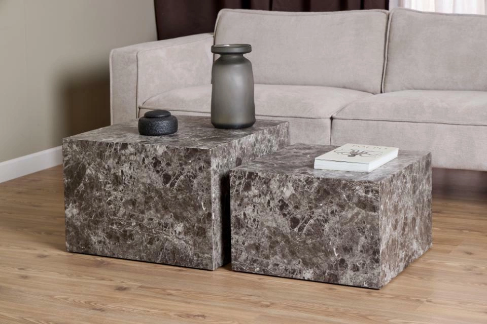 Prezentowany zestaw stolików kawowych Dice to prawdziwa gratka dla miłośników eleganckiego i praktycznego designu. Dwa stoliki, wykonane z laminowanej płyty meblowej, przypominające swoim wyglądem brązowy marmur Carrara, idealnie wkomponują się w każde wnętrze. Ich kwadratowy kształt i ciemnobrązowy kolor dodają im wyrafinowanego charakteru, a jednocześnie zapewniają funkcjonalność i łatwość w utrzymaniu czystości.