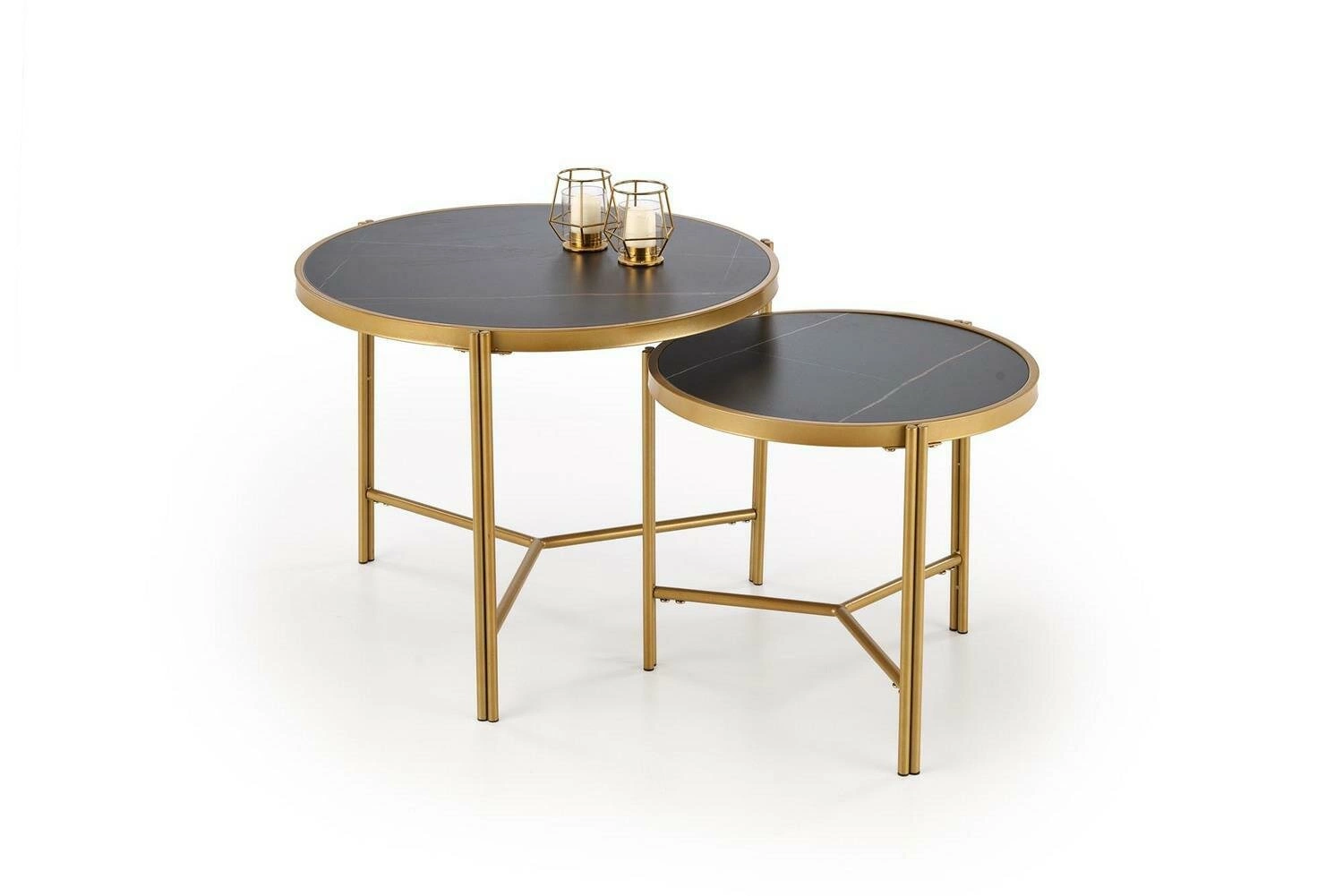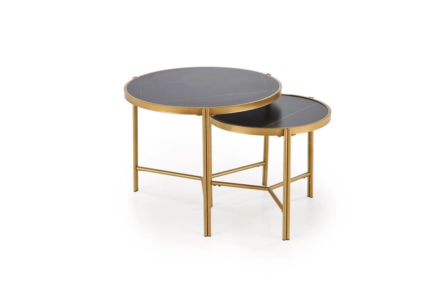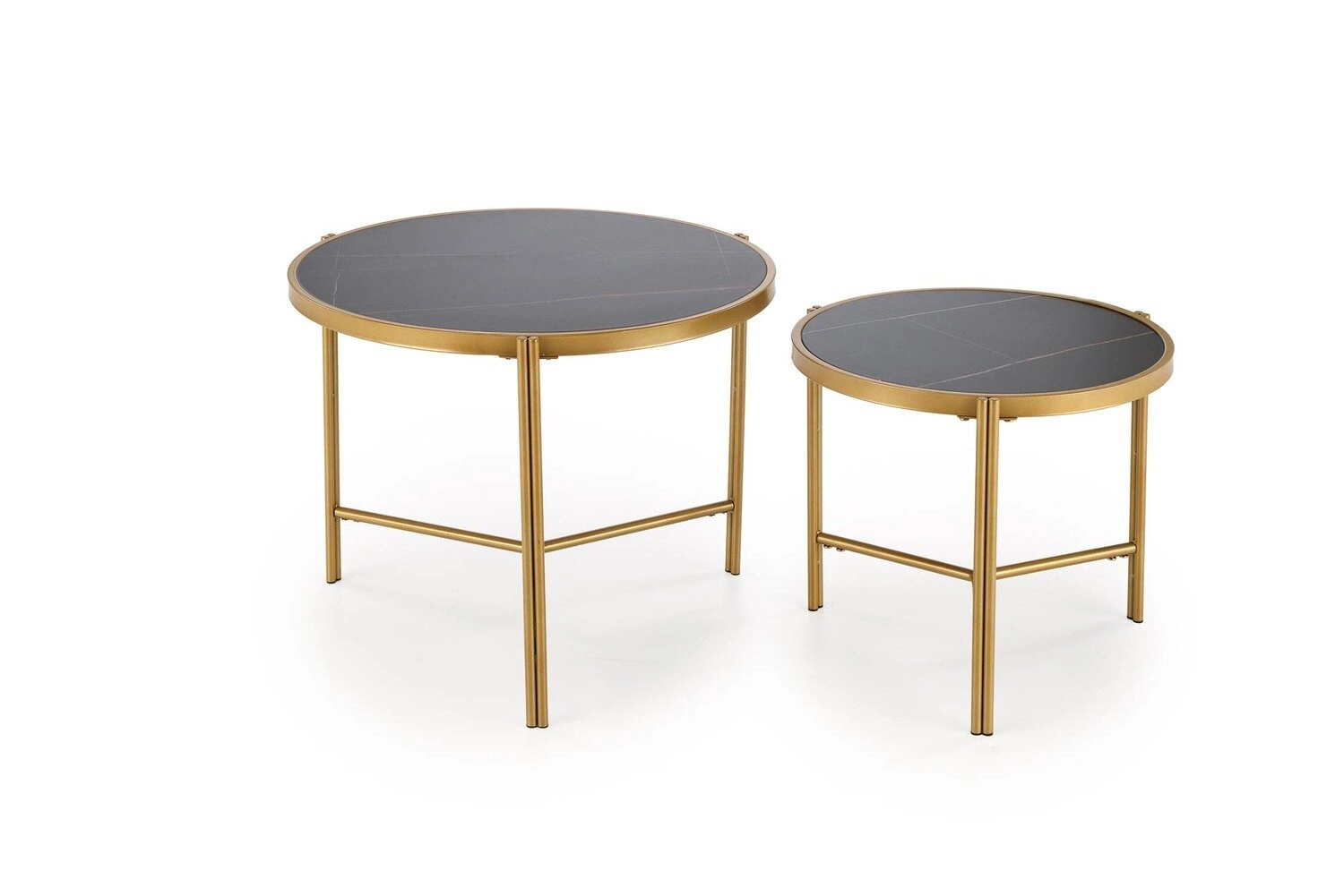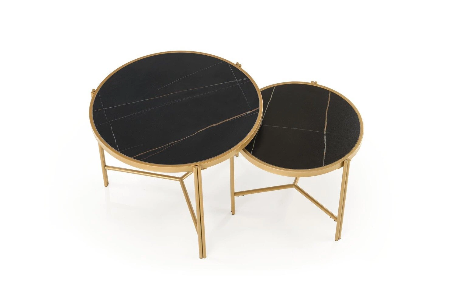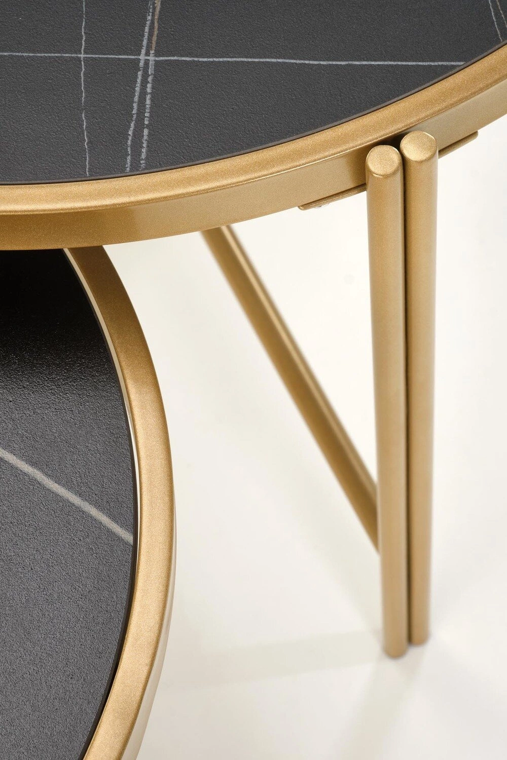 - Stoliki wykonane są z trwałego spieku w kolorze czarnego marmuru, z podstawą z proszkowo malowanej stali w kolorze złotym