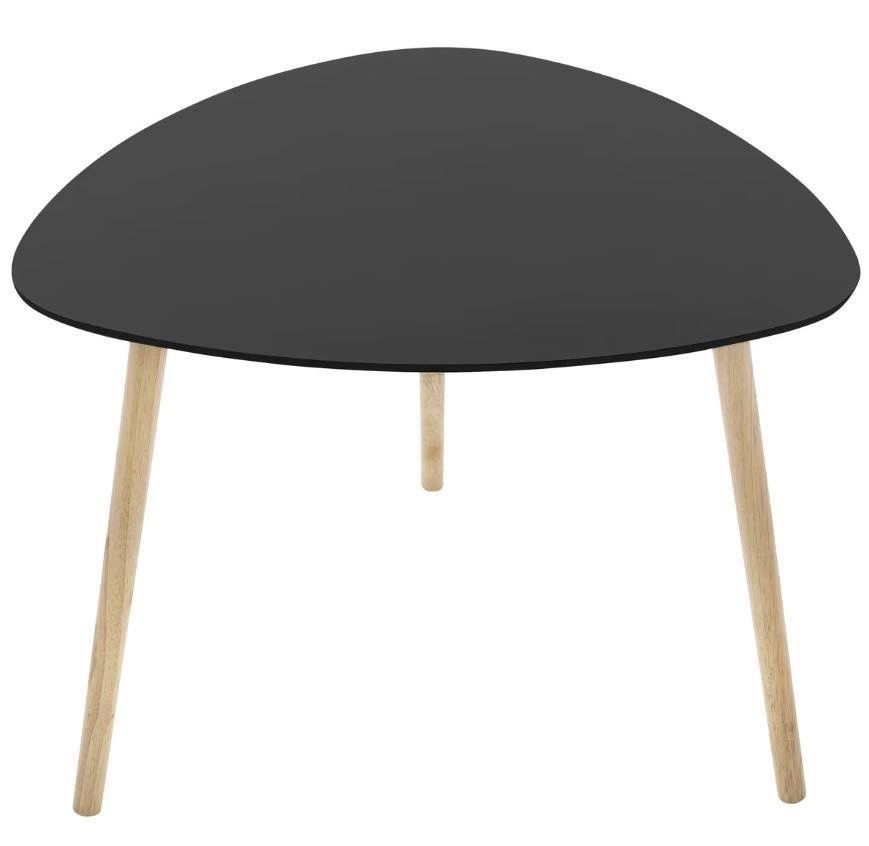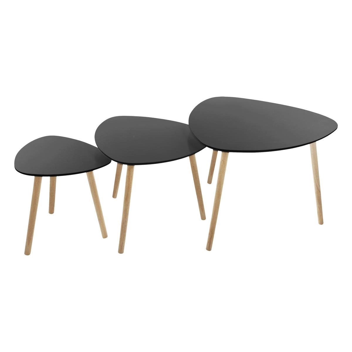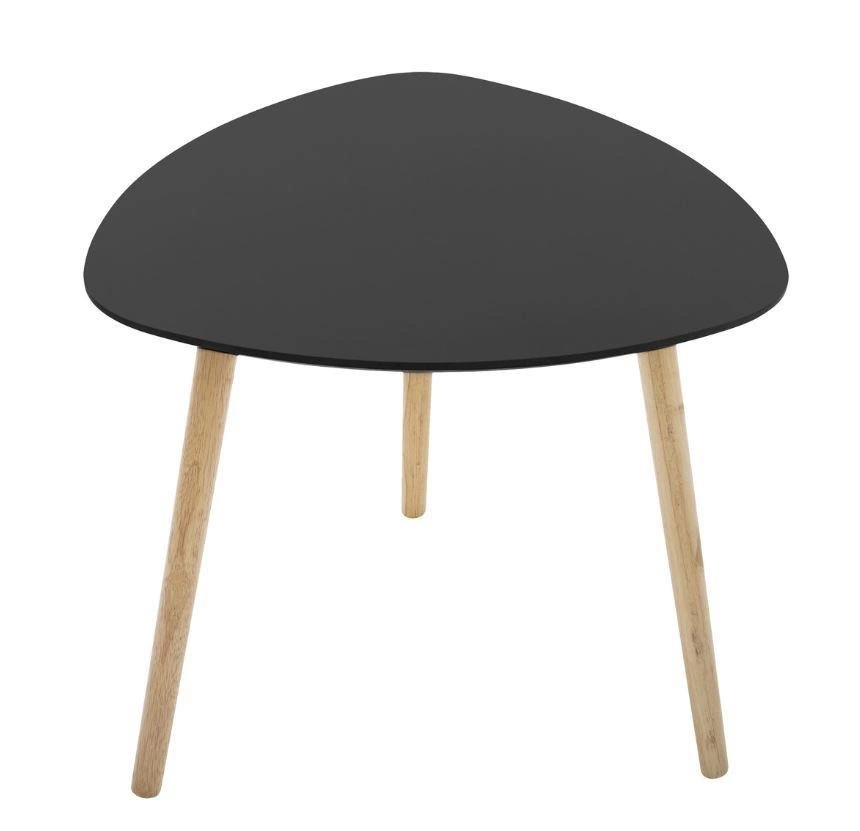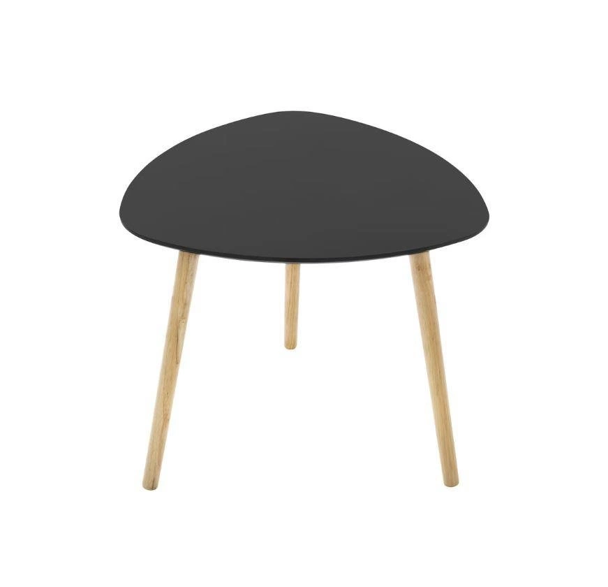 Zestaw trzech stolików w kolorze czarnym, z naturalnymi nogami, sprawdzi się w salonie obok sofy. Stoliki o trzech rozmiarach można ustawić razem lub używać całkiem osobno. Trwała płyta MDF w czarnej okleinie, jest bezpieczna i odporna na zarysowania. Podstawą stolików są nogi z drewna sosnowego.
