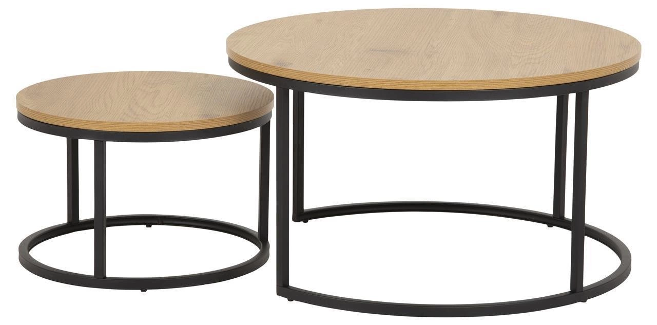 Nowoczesny komplet dwóch okrągłych stolików kawowych, których niewątpliwą zaletą jest możliwość schowania mniejszego pod większy. Okrągłe blaty stolików zostały zrobione z laminowanej płyty MDF. Laminat o wzorze oraz kolorze naturalnego dębu ciekawie współgra z czarną metalową podstawą stolików. Okrągłe stoliki posiadają wytrzymałą i stabilną podstawę wykonaną z metalu malowanego proszkowo. Zestaw stolików Spiro to idealne stoliki kawowe do salonu lub poczekalni. Stoliki w stylu nowoczesnym odnajdą się w każdym wnętrzu i będą jego ozdobą.