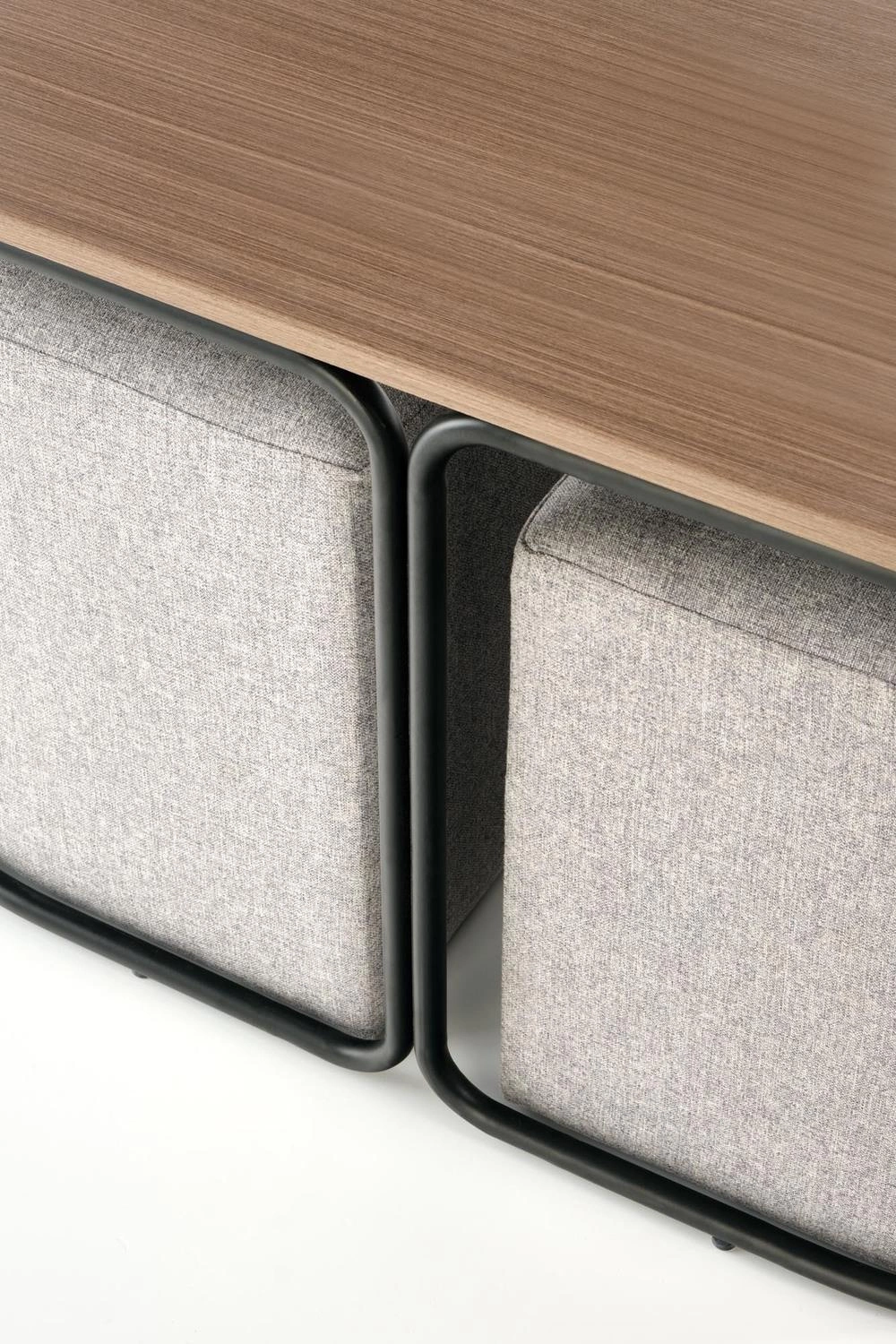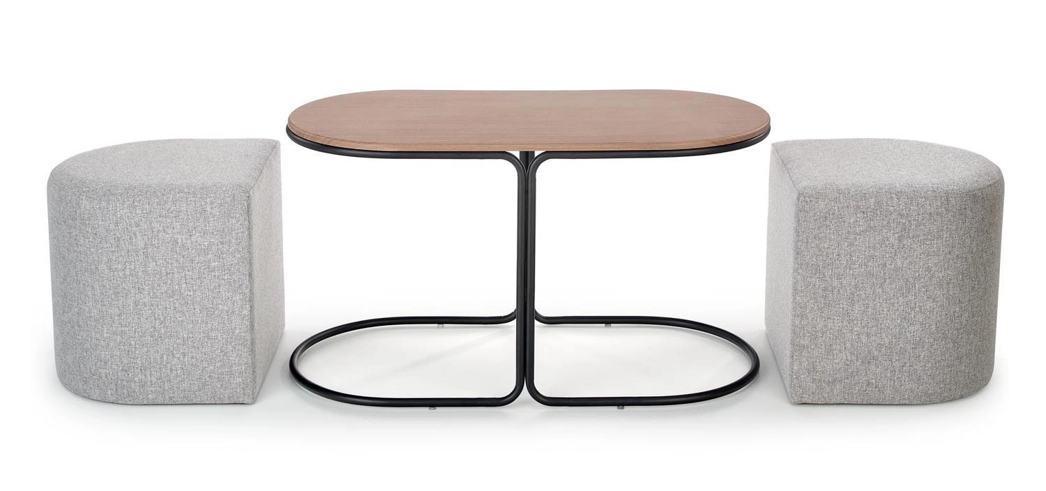 Kolorystyka zestawu - orzech, popielaty i czarny - dodaje mu elegancji i klasy. Wymiary puf - 40x35x40 cm - sprawiają, że są one idealne do wykorzystania jako dodatkowe miejsce do siedzenia lub jako podnóżek. Wygodne i miękkie siedzisko pozwoli Ci zrelaksować się i odpocząć po długim dniu. Dodatkowo, pufy można łatwo przenieść i umieścić w dowolnym miejscu, w zależności od Twoich potrzeb.