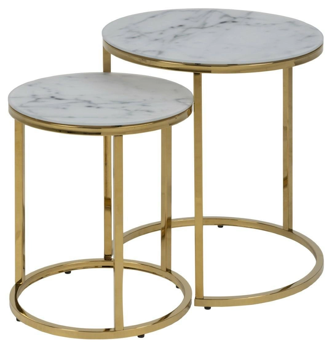 ZESTAW STOLIKÓW KAWOWYCH ALISMA to część większej kolekcji. Są to dwa stoliki o różnych wielkościach, które będą doskonale wyglądać zarówno postawione obok siebie jak i oddzielnie. Posiadają one szklany blat o grubości 6 mm, który jest wytrzymały, solidny i imituje biały marmur. Do tego każdy stolik posiada stabilną podstawę w kolorze złota, która podkreśla ich charakter. Zostały one zaprojektowane tak, by można było je do siebie dosunąć, dzięki czemu wyglądają spójnie jak jeden mebel. Większy stolik ma wymiary 45 × 45 × 50 cm, mniejszy natomiast 35 × 35 × 42 cm.