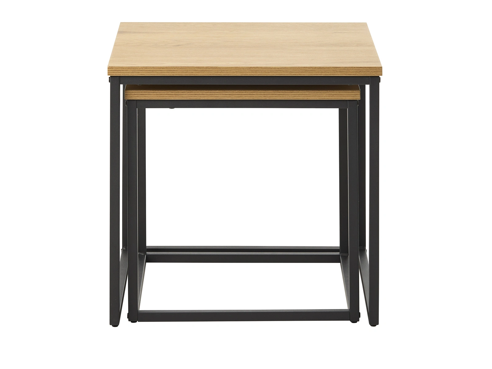 Ten nowoczesny zestaw stolików kawowych zachwyca minimalistyczną formą i solidnym wykonaniem. Kwadratowe blaty z płyty MDF wykończone naturalnym fornirem dębowym wprowadzają do wnętrza przytulny akcent, a wytrzymała, malowana proszkowo podstawa na płozach dodaje całości industrialnego charakteru. Dzięki zróżnicowanej wysokości stolików możesz dowolnie je zestawiać lub rozdzielić – wykorzystując jeden jako stolik kawowy do salonu, a drugi jako stolik pomocniczy czy ławę kawową.Funkcjonalność i design – idealne do nowoczesnych wnętrz