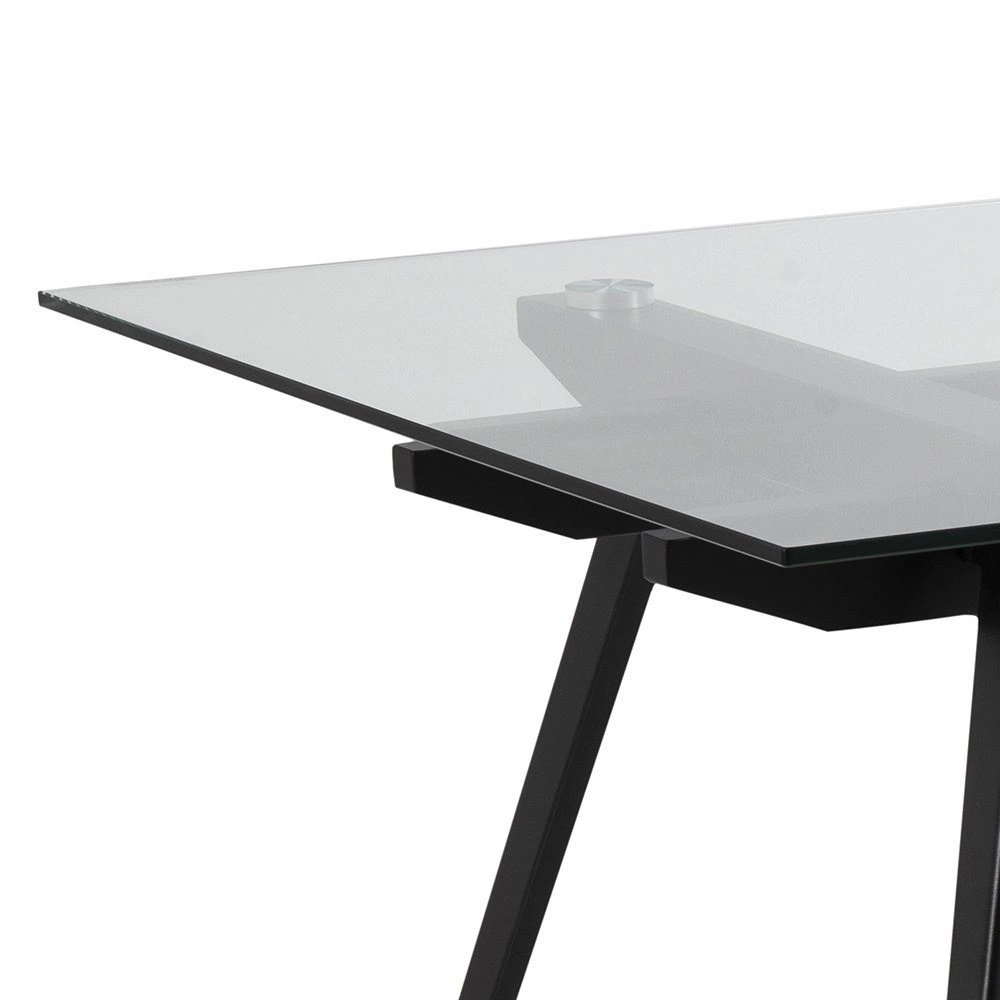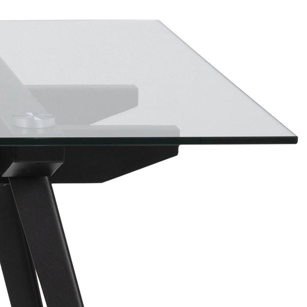 Nowoczesny stolik Monti o oryginalnej konstrukcji będzie eleganckim dodatkiem do każdego wnętrza. Podstawa stolika wykonana jest ze stali polakierowanej na czarno. Zwężające się ku dołowi nogi są dość szeroko rozstawione. U góry nogi połączone są czterema belkami, z których dwie są ułożone ukośnie i mają ścięte końce. Kształt konstrukcji nadaje stołowi orientalnego charakteru. Blat stołu wykonany jest z hartowanego szkła i podpierają go cztery okrągłe metalowe podkładki widoczne przez szybę. Formalny stół znakomity do części jadalnianej w salonie lub nowoczesnej kuchni.