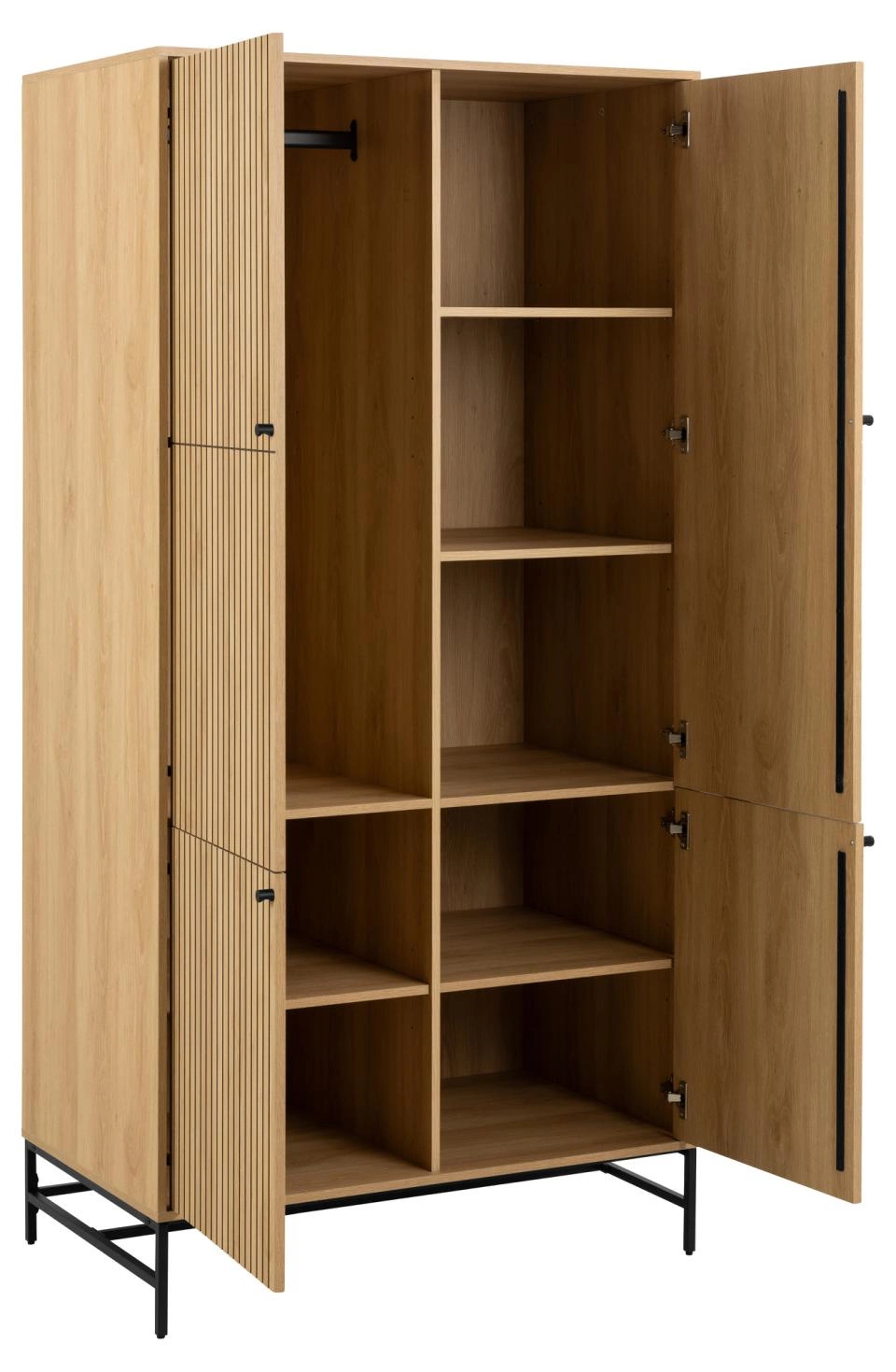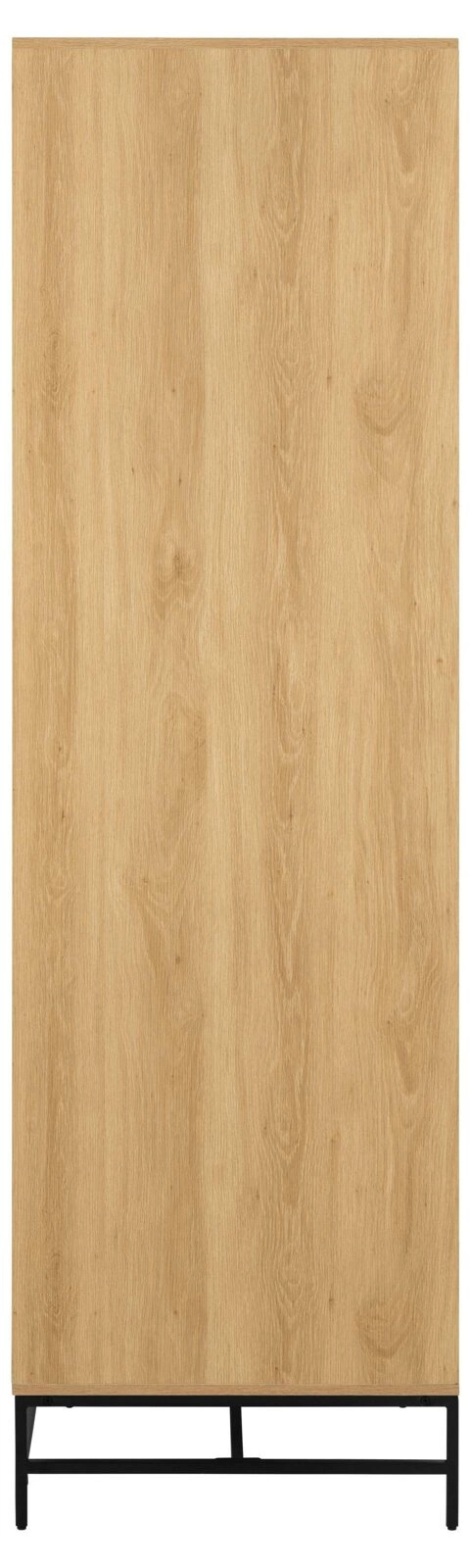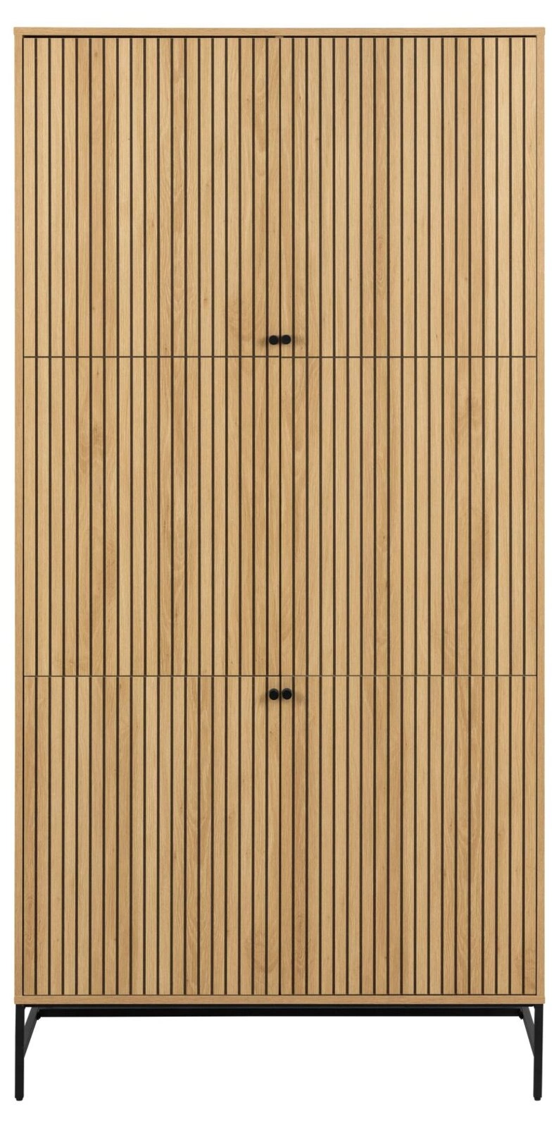 Szafa Albany to nowoczesna szafa z ryflowanym frontem w kolorze naturalnego dębu, która doskonale sprawdzi się w sypialni lub garderobie. Mebel o wymiarach 200 cm wysokości, 99 cm szerokości i 60 cm głębokości oferuje aż 6 pojemnych półek oraz 2 zamykane szafki, zapewniając funkcjonalną przestrzeń do przechowywania ubrań i dodatków. Stalowa, czarna podstawa podkreśla jej współczesny charakter, a półmatowe wykończenie ułatwia utrzymanie czystości.