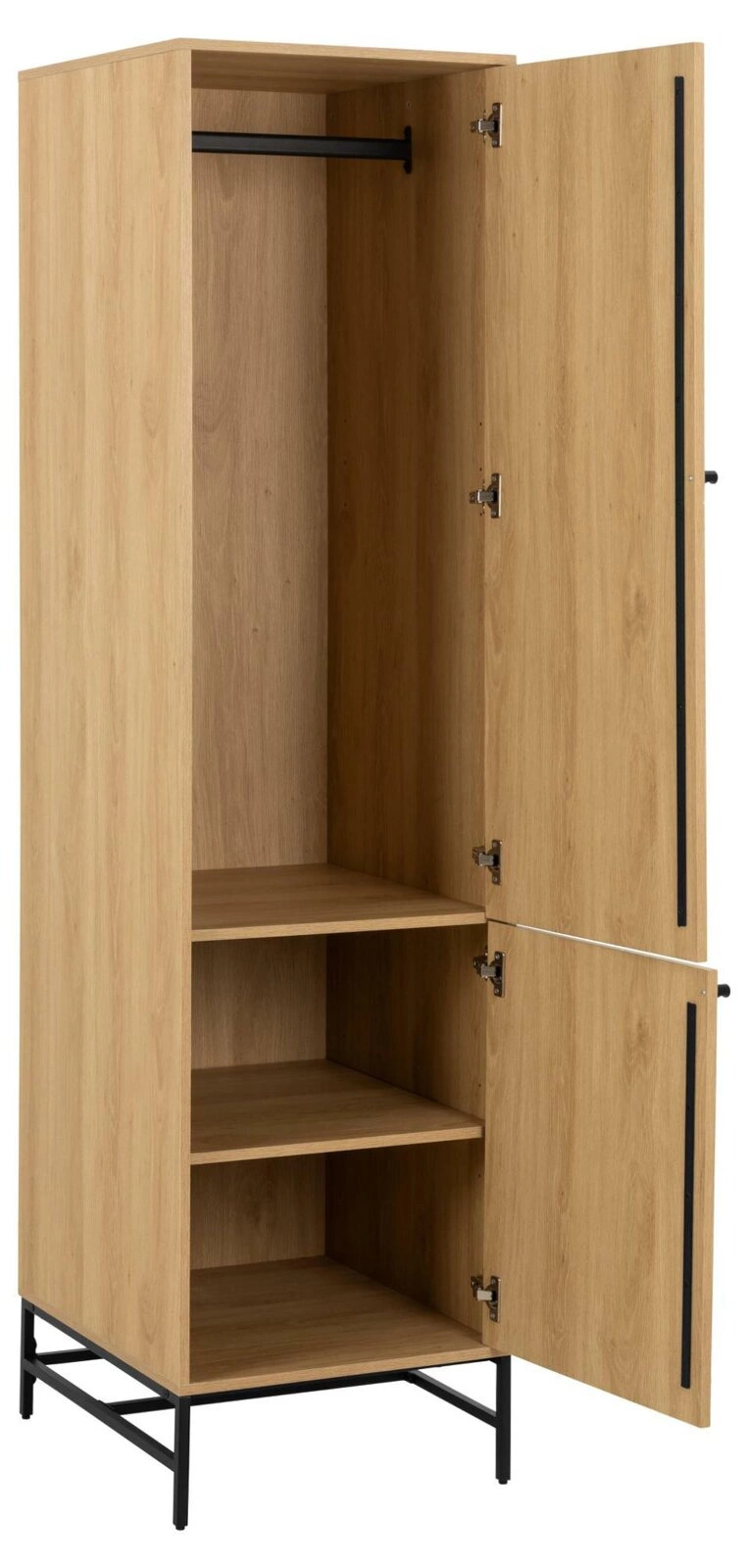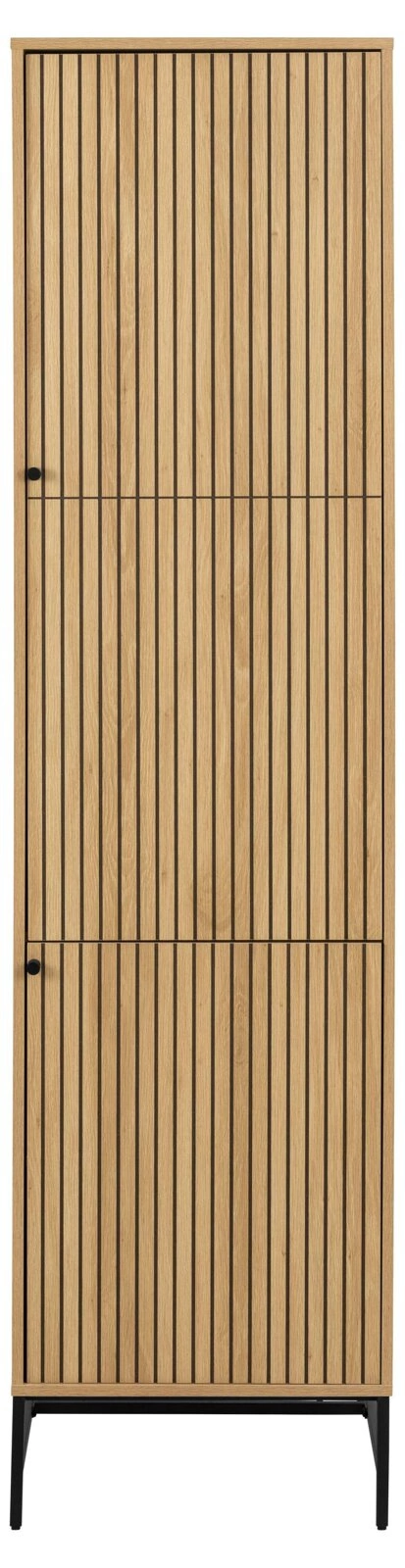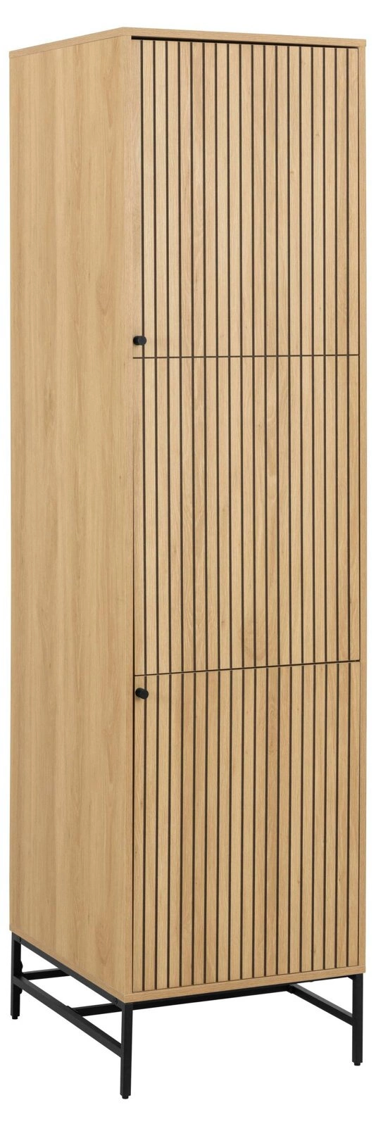 Szafa Albany to smukła szafa z lamelami w kolorze naturalnego dębu, zaprojektowana z myślą o nowoczesnych i stylowych wnętrzach. Mebel o wysokości 200 cm, szerokości 51 cm i głębokości 60 cm, z frontem ryflowanym i solidną podstawą ze stali, świetnie sprawdzi się zarówno w sypialni, jak i w garderobie. Dzięki dwóm półkom i trzem pojemnym szafkom, Albany oferuje funkcjonalne przechowywanie odzieży oraz dodatków, nie zajmując przy tym dużo miejsca.