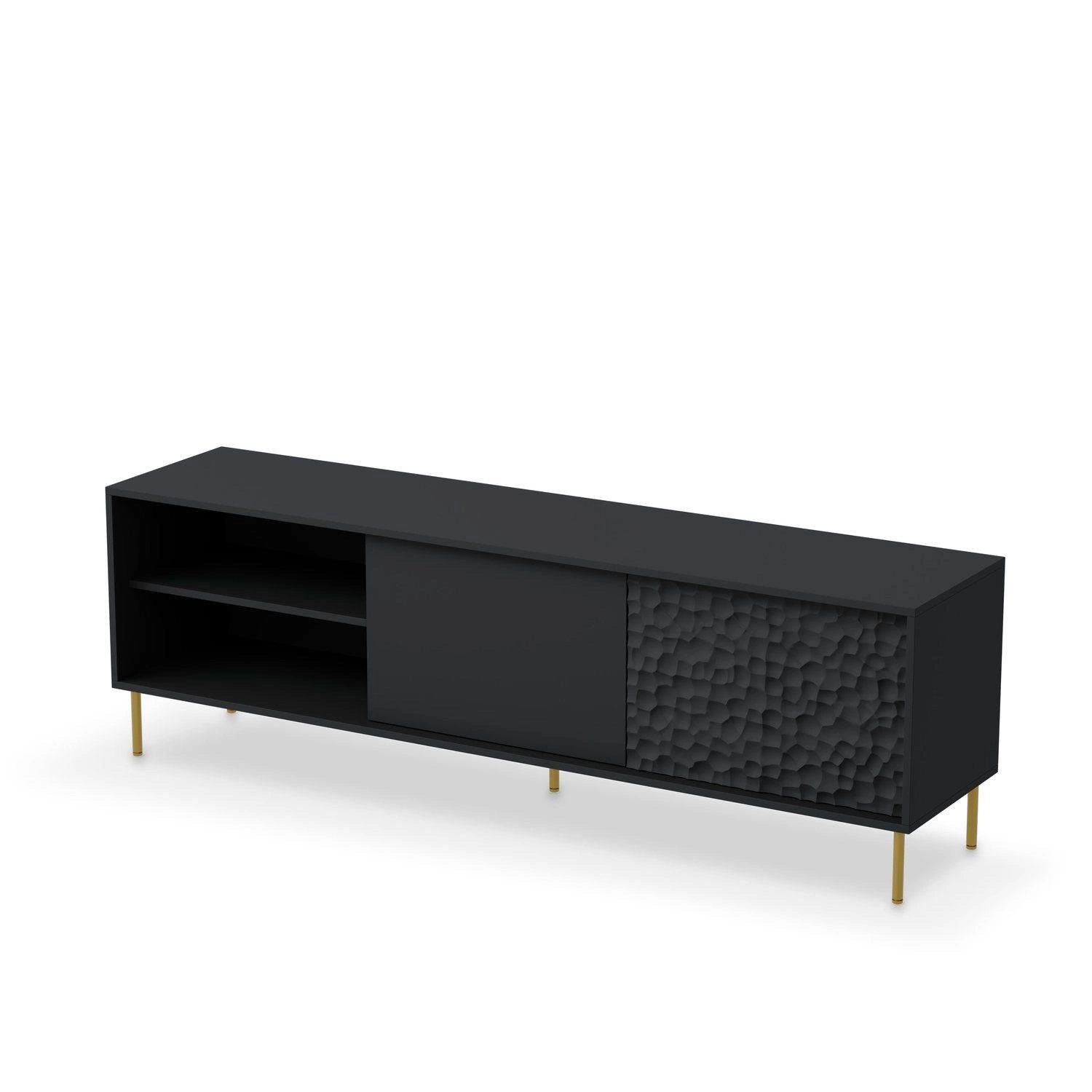 Mebel ma imponujące wymiary 180/41/58 cm i został wykonany z wysokiej jakości materiałów. Blat szafki wykonany jest z laminowanego MDF-u, który gwarantuje trwałość i łatwość w utrzymaniu czystości. Natomiast nóżki wykonane są z polipropylenu, a ich złoty kolor dodaje szafce elegancji i prestiżu. Kolekcja Afir charakteryzuje się wyrafinowanym stylem i starannym wykonaniem. Meble z tej kolekcji wykonane są z czarnej płyty MDF, a ich fronty ozdobione są dekorem 3D w formie wgłębień, nadając im unikalny wygląd. Całość prezentuje się bardzo elegancko i luksusowo, będąc doskonałym elementem dekoracyjnym w różnych stylach wnętrzarskich, od nowoczesnych po klasyczne. Szafka to niezwykle praktyczne rozwiązanie do przechowywania, które oferuje zarówno otwarte półki, jak i zamykane szafki. Dzięki temu, możesz wygodnie i estetycznie przechowywać swoje urządzenia RTV, a jednocześnie ukryć drobne przedmioty, które nie muszą być na widoku.