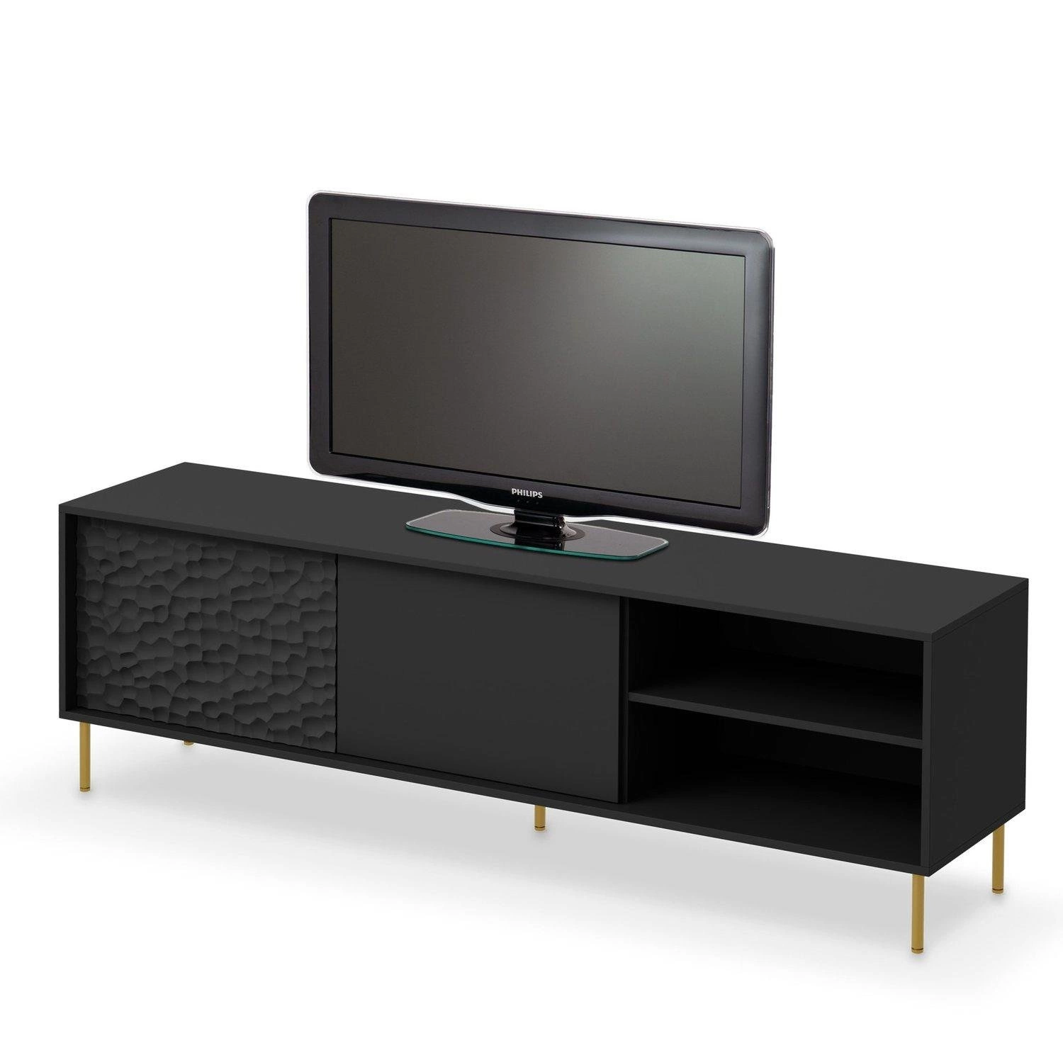 Mebel ma imponujące wymiary 180/41/58 cm i został wykonany z wysokiej jakości materiałów. Blat szafki wykonany jest z laminowanego MDF-u, który gwarantuje trwałość i łatwość w utrzymaniu czystości. Natomiast nóżki wykonane są z polipropylenu, a ich złoty kolor dodaje szafce elegancji i prestiżu. Kolekcja Afir charakteryzuje się wyrafinowanym stylem i starannym wykonaniem. Meble z tej kolekcji wykonane są z czarnej płyty MDF, a ich fronty ozdobione są dekorem 3D w formie wgłębień, nadając im unikalny wygląd. Całość prezentuje się bardzo elegancko i luksusowo, będąc doskonałym elementem dekoracyjnym w różnych stylach wnętrzarskich, od nowoczesnych po klasyczne. Szafka to niezwykle praktyczne rozwiązanie do przechowywania, które oferuje zarówno otwarte półki, jak i zamykane szafki. Dzięki temu, możesz wygodnie i estetycznie przechowywać swoje urządzenia RTV, a jednocześnie ukryć drobne przedmioty, które nie muszą być na widoku.