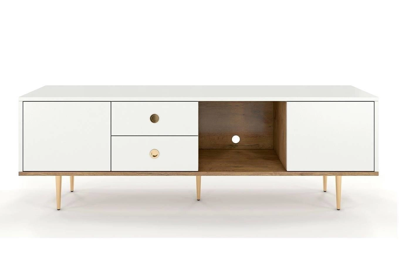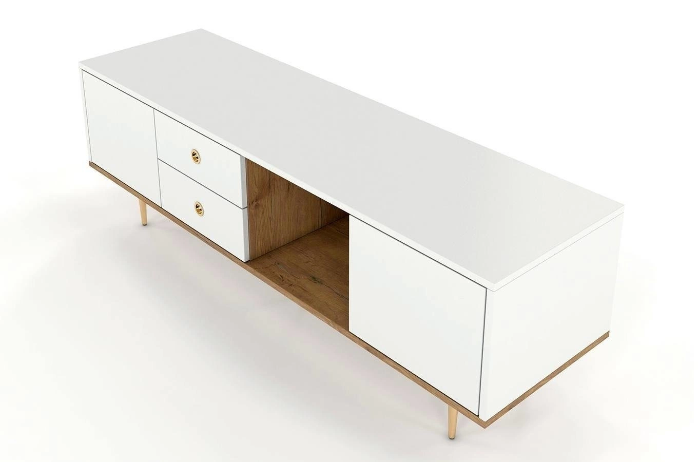 Szafka Skandica HARMONI to praktyczny mebel, który ułatwia organizację sprzętu rtv oraz innych przedmiotów. Z prawej i lewej strony mebla znajdują się drzwiczki otwierane za pomocą systemu “push to open” za którymi znajduje się półka. W części środkowej zaprojektowano dwie szuflady. Mimo tego iż posiadają ozdobne uchwyty, to wszystkie otwierają się za pomocą systemu “push to open”. Szuflady posiadają także funkcję cichego domykania. Komoda została także wyposażona w odsłoniętą półkę na ozdobne przedmioty lub sprzęt elektroniczny.