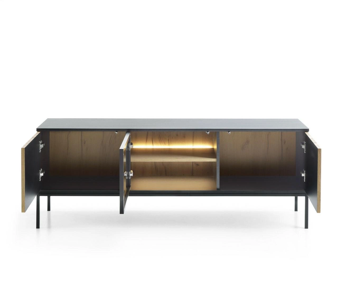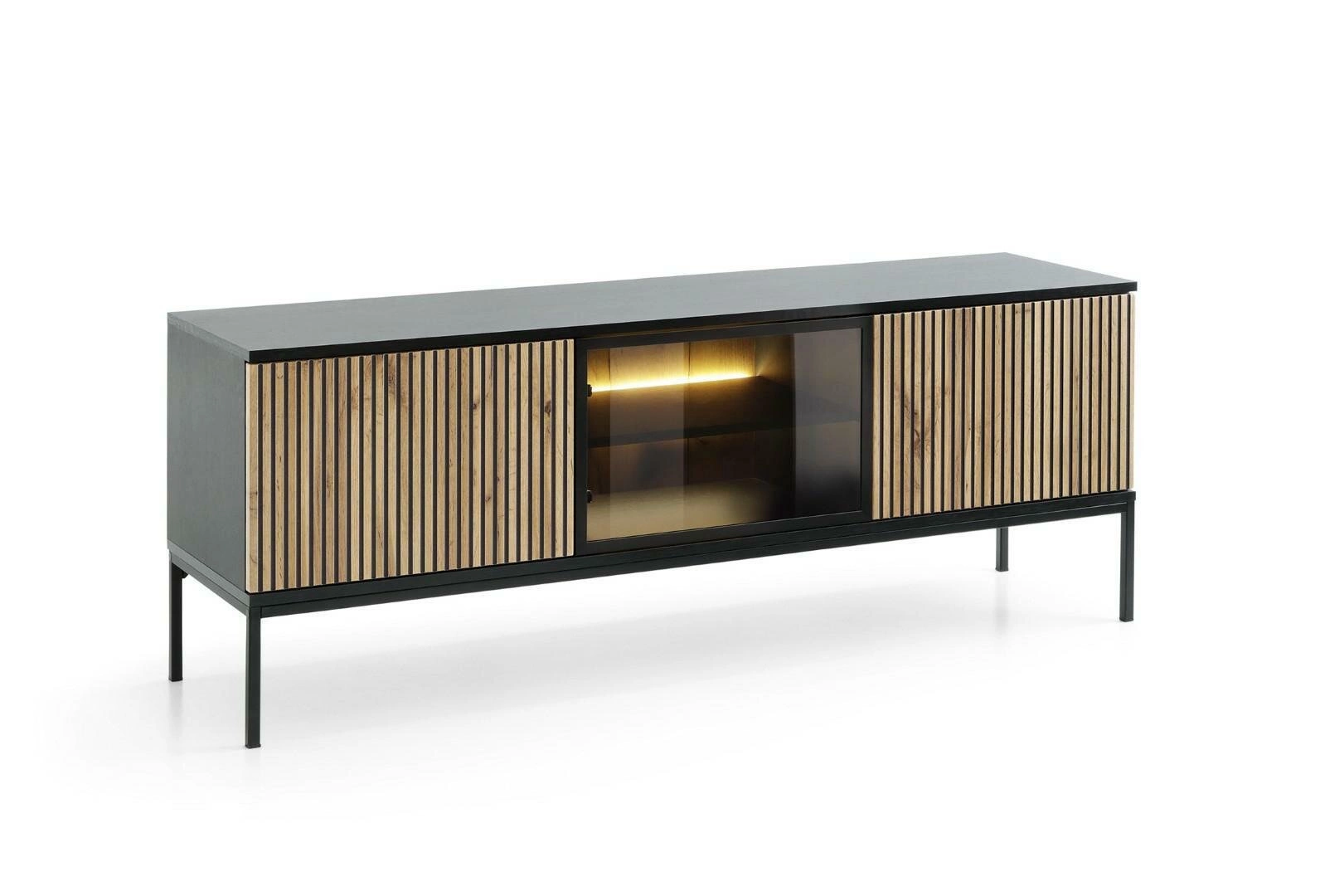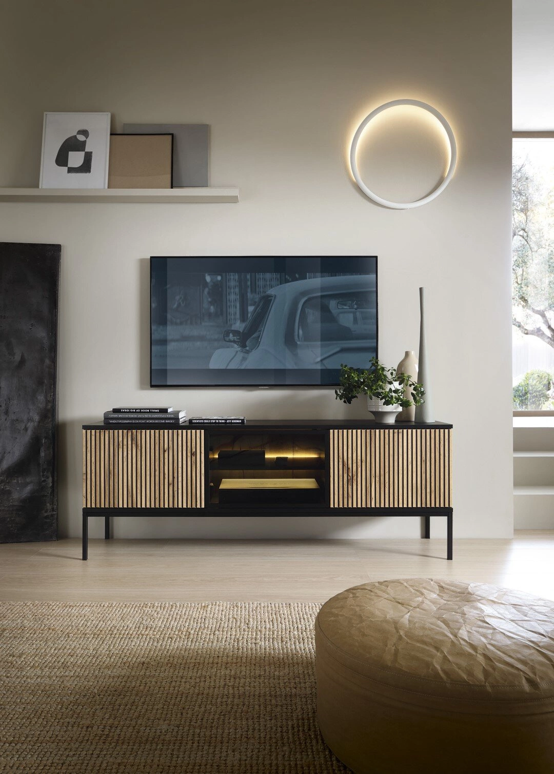 Szafka RTV czarna drewniana Novel 154 cm z oświetleniem LED i frezowanym frontem marki Intesi to propozycja dla osób ceniących wyrazisty, nowoczesny styl oraz funkcjonalność. Wykonana z solidnej płyty MDF i metalu, wykończona w półmacie, zachwyca pionowo frezowanym frontem i eleganckimi detalami. Szerokość 154 cm sprawia, że szafka idealnie sprawdzi się jako podstawa pod telewizor do 70 cali, stając się praktycznym i efektownym centrum każdego salonu.